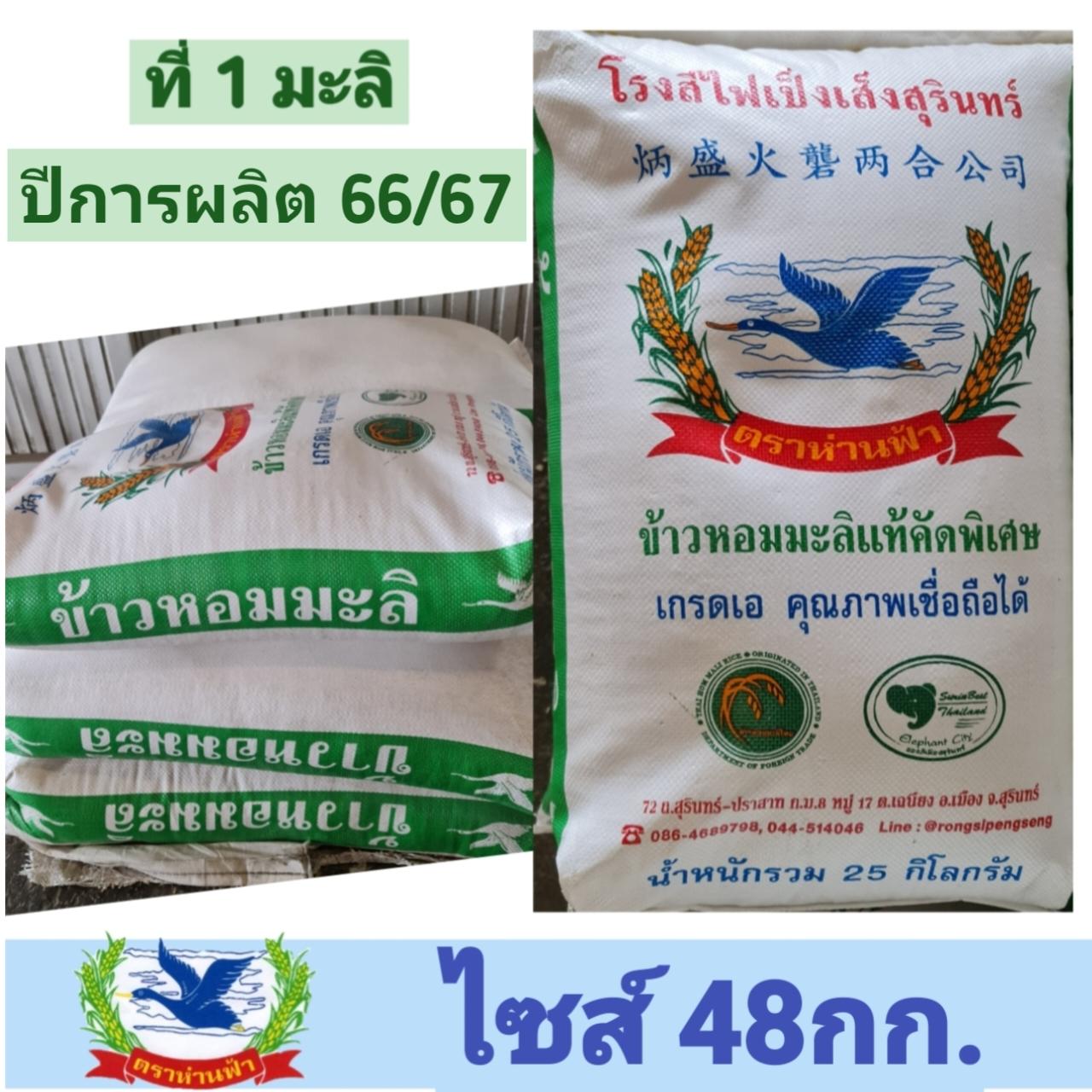 Jasmine Rice ข้าวหอมมะลิแท้คัดพิเศษปี66/67 - ข้าวใหม่ต้นฤดู (ข้าวที่1-ชนิดเต็มเมล็ด) "ข้าวตราห่านฟ้า" ปลอดสารเคมีอบมอด ขนาด 48 กก.