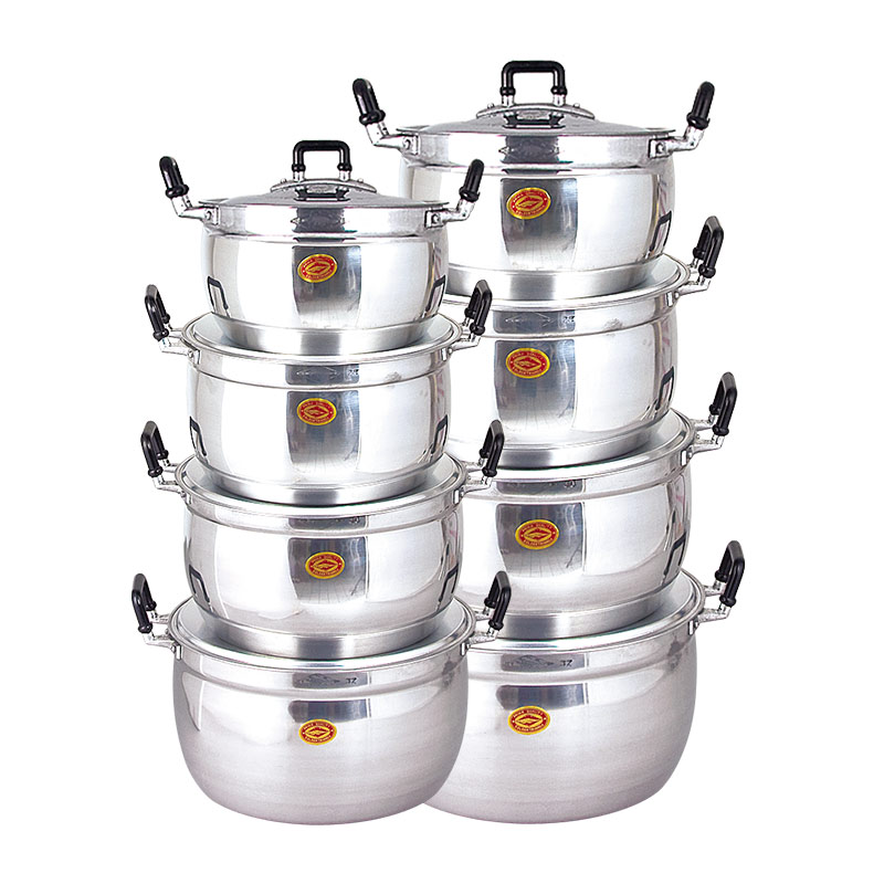 Description :Aluminium - 1 Set: Size 18 cm. / 20 cm. / 22 cm. / 24 cm. / 26 cm. / 28 cm. / 30 cm. / 32 cm. - Bakelite handle: Sticky, Resistant to heat Product - Used for soup and curry or keep warm