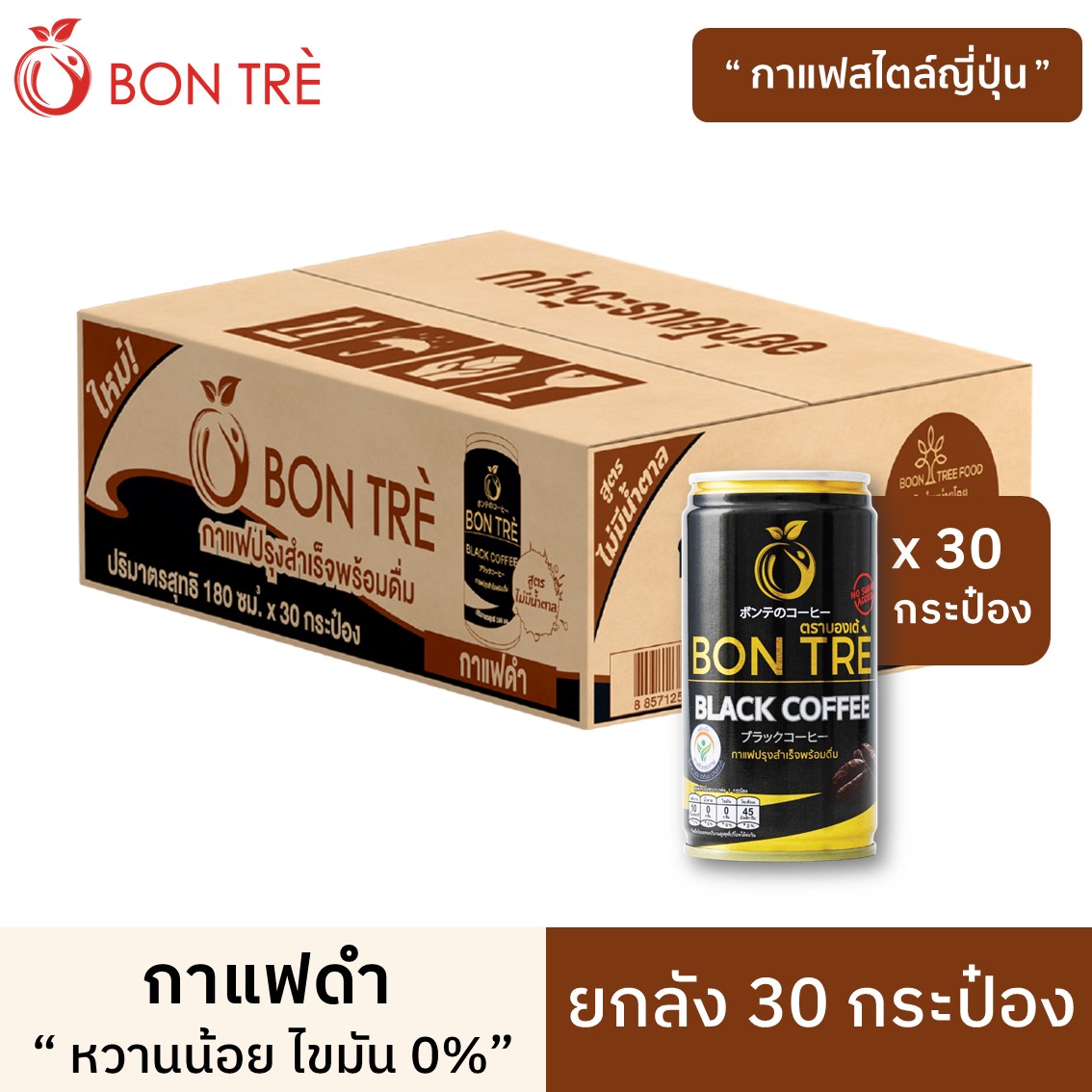 [ยกลัง] BON TRE บองเต้ กาแฟดำ สูตรไม่เติมน้ำตาล (180ml X 30 กระป๋อง) BLACK COFFEE NO SUGAR