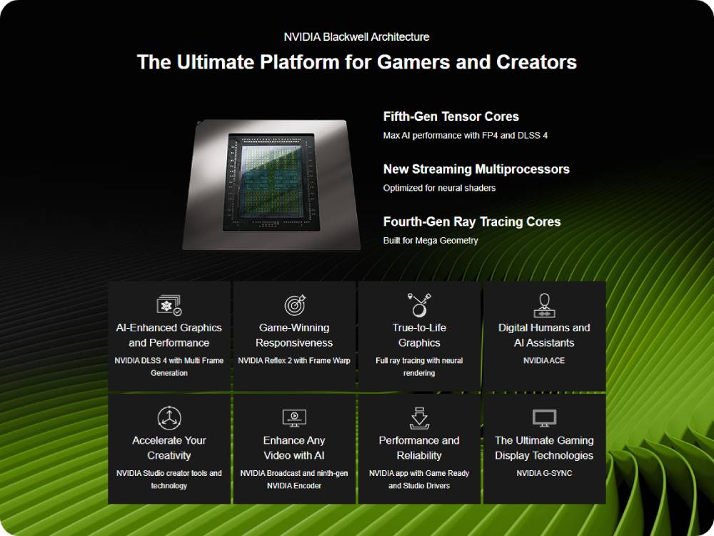 DLSS คือชุดเทคโนโลยีการเรนเดอร์ประสาทที่ปฏิวัติวงการซึ่งใช้ AI เพื่อเพิ่ม FPS ลดเวลาแฝง และปรับปรุงคุณภาพของภาพ ความก้าวหน้าล่าสุด DLSS 4 นำเสนอการสร้างเฟรมหลายเฟรมใหม่ การสร้างเรย์ใหม่และความละเอียดสูงสุดที่ปรับปรุงแล้ว ขับเคลื่อนโดย GPU GeForce RTX™ 50 Series และ Tensor Core รุ่นที่ห้า DLSS บน GeForce RTX™ เป็นวิธีที่ดีที่สุดในการเล่นเกม โดยได้รับการสนับสนุนจากซูเปอร์คอมพิวเตอร์ AI ของ NVIDIA ในคลาวด์ที่ปรับปรุงความสามารถในการเล่นเกมของพีซีของคุณอย่างต่อเนื่อง