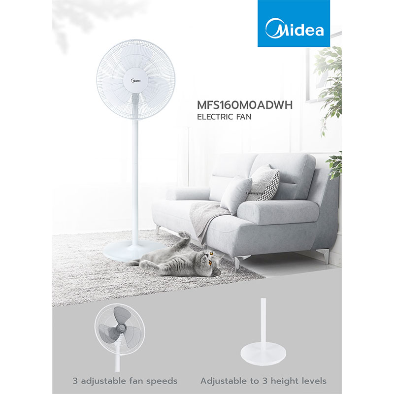 The Midea Floor Fan model MFS160M0ADWH features a 16-inch wide fan blade that delivers cool and powerful airflow with easy-to-clean removable grill.