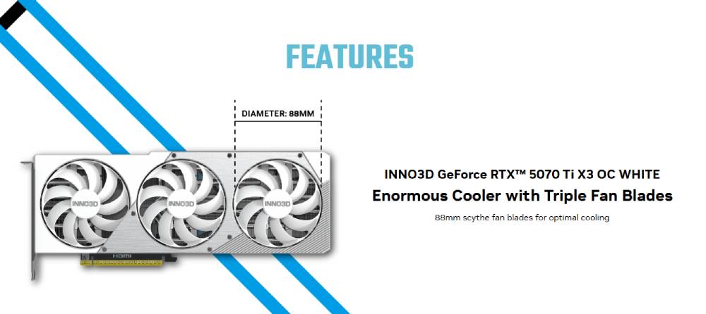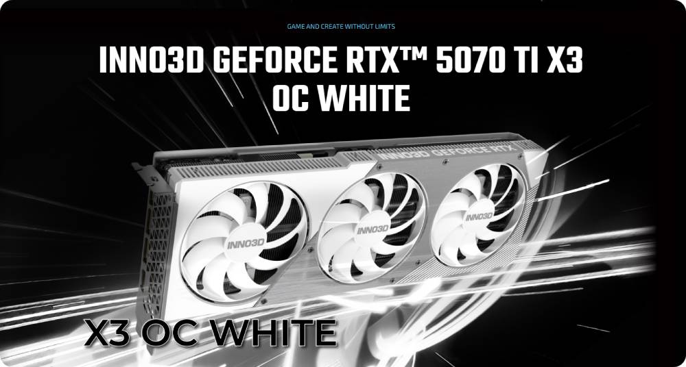 INNO3D GeForce RTX 50 Series รับประกันประสิทธิภาพที่โดดเด่นจากการ์ดจอรุ่นถัดไปที่ขับเคลื่อนด้วย สถาปัตยกรรม Blackwell ของ NVIDIA การ์ดจอ INNO3D GeForce RTX 50 Series มาพร้อมประสิทธิภาพที่โดดเด่นจากการ์ดจอรุ่นใหม่ที่ขับเคลื่อนด้วยสถาปัตยกรรม Blackwell ของ Nvidia การ์ดจอ INNO3D GeForce RTX 5070 Ti X3 OC WHITE นำเสนอเทคโนโลยีกราฟิกยุคใหม่ด้วย GPU เหล่านี้ที่สร้างมาตรฐานใหม่ด้านประสิทธิภาพ X3 OC WHITE เหนือกว่าพลังดิบด้วยการออกแบบใหม่ที่สวยงามซึ่งผสมผสานรูปแบบและฟังก์ชันได้อย่างลงตัว การผสมผสานที่ลงตัวระหว่างสุนทรียศาสตร์และเทคโนโลยีล้ำสมัยนี้ทำให้ INNO3D ได้รับการยกย่องอย่างกว้างขวาง ตอกย้ำสถานะของตนในฐานะผู้บุกเบิกนวัตกรรมกราฟิก รุ่น WHITE นำเสนอรูปแบบสีขาวที่โดดเด่นและสง่างาม ซึ่งทำให้แตกต่างจากการออกแบบการ์ดจอมาตรฐาน รุ่นนี้มีฝาครอบสีขาวสะอาดตาที่ปกคลุมระบบระบายความร้อนทั้งหมด สร้างสุนทรียศาสตร์ที่สะอาดตาและทันสมัยที่สามารถเป็นจุดเด่นในพีซีรุ่นใดก็ได้