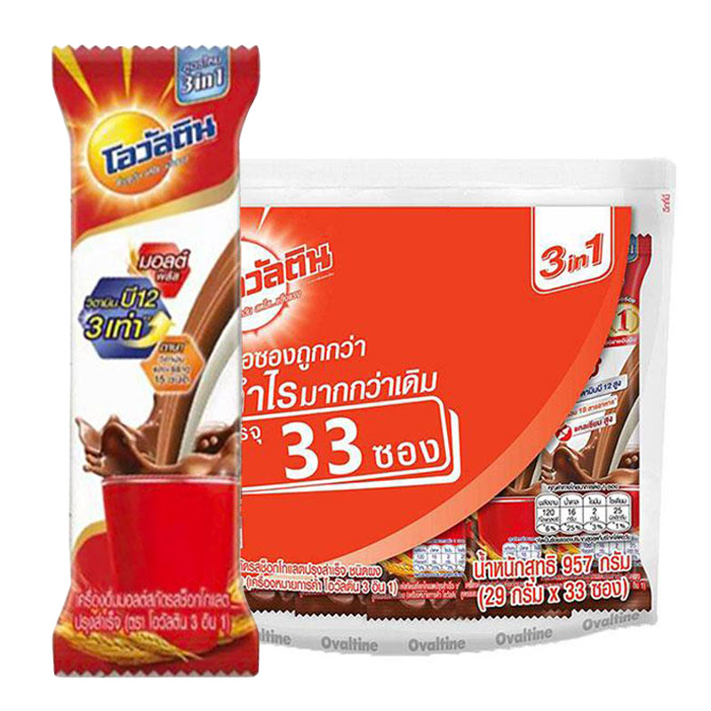 - Name: OVALTINE 3IN1 Ready Mixed Malt Beverage Chocolate Flavor 29 g 33 sachets - Brand: OVALTINE - Unit Amount: 33 unit(s) How to Preserve: Store in a cool, dry place away from direct sunlight and humidity