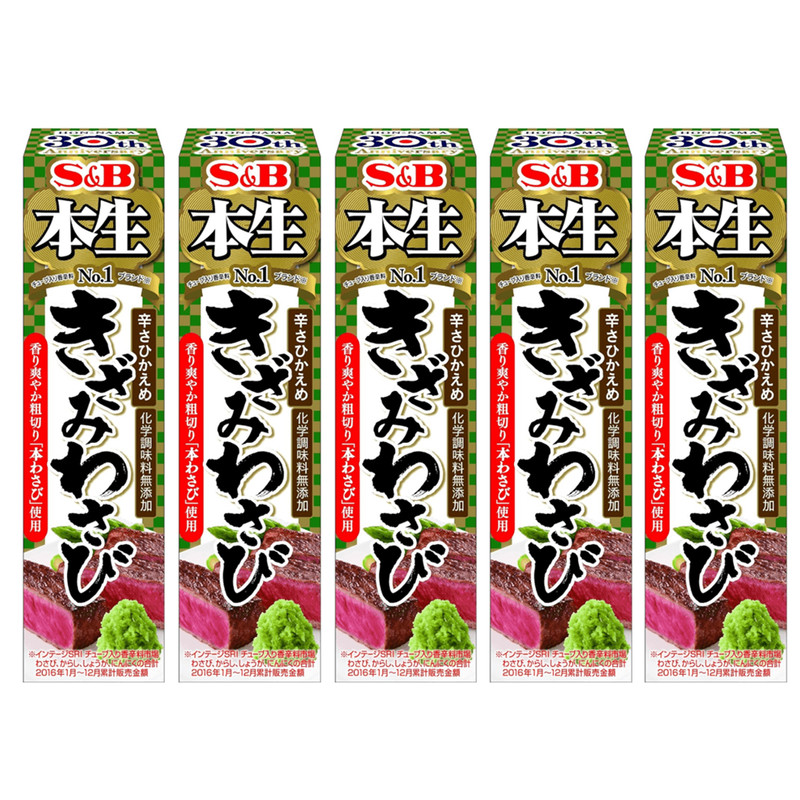 S & B Honnama Kizami Wasabi - 100% Genuine Coarsely Chopped Wasabi for Sashimi, Sushi, Steak, BBQ - Tube Type - Made in Japan - Set of 5 Pieces - 5 x 43 G.