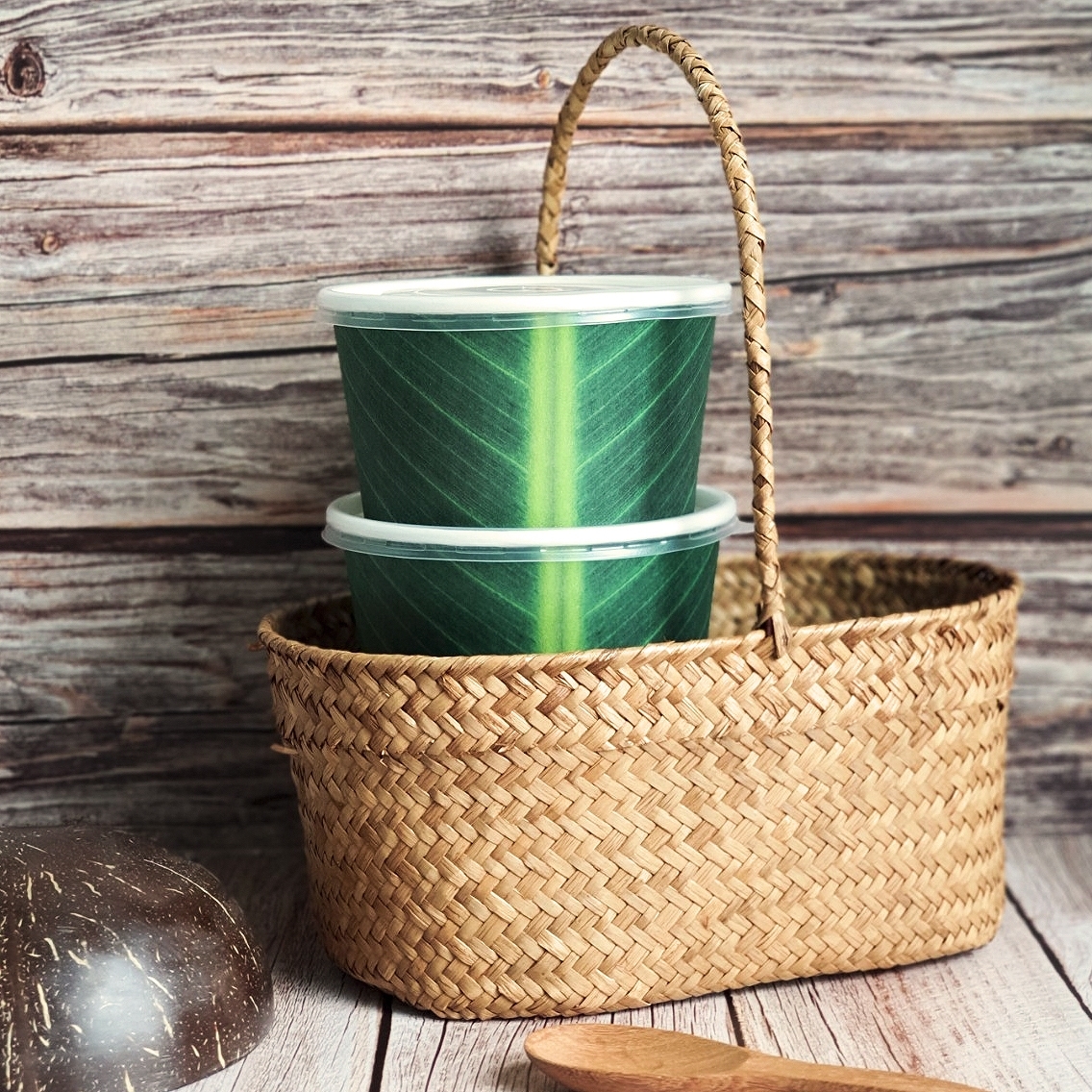 ถ้วยกระดาษ 850 มล. ลายใบตอง ไซส์ S2 - ขนาด ปากกว้าง 13.5 x สูง 8 ซม. - ถ้วยกระดาษทนความร้อนได้ 100 องศา ด้านในเคลือบกันซึม ใส่อาหารแล้วไม่รั่วไม่ซึม - สำหรับใส่อาหาร อาทิเช่น ก๋วยเตี๋ยว สปาเก็ตตี้ สลัดผัก เป็นต้น