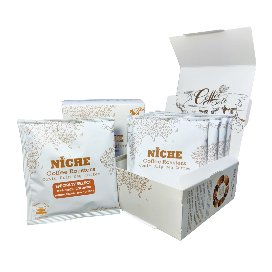 สัมผัสรสชาติใหม่ด้วยสูตรกาแฟเบลนด์เฉพาะ จากเมล็ดกาแฟ 3 แหล่งชั้นนำ คั่วระดับกลาง ให้รสสัมผัสหนักแน่นในโทนช็อกโกแลตและคาราเมล ตอบโจทย์คอกาแฟชาว ไทยที่ต้องการ สัมผัสความหอมกรุ่น และสดใหม่ - Tasting Note : Cocoa, Cinnamon, Chocolate, Honey, and Caramel. Smooth and creamy. Bright acidity - I-CONIC DRIP หรือ กาแฟดริปรูปทรงกรวยคล้าย V60 ผลิตโดย บริษัท เดอะ คอฟฟี่ บีน โรสติ้ง ภายใต้แบรนด์ NICHE COFFEE ROASTERS ด้วยเครื่องบรรจุที่ทันสมัยและเยื่อกรองกาแฟจากประเทศญี่ปุ่น ซึ่งมีชื่อเรียกว่า I-CONIC (ทรงกรวย) รูปแบบกาแฟดริป I-CONIC เป็นรูปแบบใหม่ พัฒนาจากแนวคิดการพับกระดาษโอริกามิ จากเดิมที่เป็นซองเยื่อกระดาษกรองกาแฟหูเกี่ยวแก้วทรง PACHIT (รูปทรงแบบถุง) ซึ่งกำลังเป็นที่นิยมในปัจจุบันนี้ เยื่อกระดาษกรองทรงกรวยนี้ ทำให้ได้กาแฟรสชาติที่โดดเด่นและเข้มข้น เทียบเท่ากับการชงด้วยอุปกรณ์กาแฟดริปแบบทรงกรวย - ซองเยื่อกระดาษกรองกาแฟดริป I-CONIC ได้ถอดแบบจากอุปกรณ์การชงกาแฟดริปที่ต้องใช้กรวยกรองกาแฟ รูปทรงกรวยหรือที่เรียกว่าทรง V60 มาผสมผสานเทคนิคการพับกระดาษ ขึ้นรูปทรงด้วยเครื่องจักรบรรจุจากประเทศญี่ปุ่น ออกมาเป็นเยื่อกระดาษกรองกาแฟ รูปทรงกรวย หรือที่เรียกว่า I-CONIC (หรือจะเรียกว่าทรง Cone ก็ได้) เยื่อกระดาษทรงกรวยกรองนี้จะบรรจุกาแฟคั่วบดพร้อมชงโดยไม่ต้องใช้อุปกรณ์ในการชง เพียงแค่มีน้ำร้อนและแก้วกาแฟเท่านั้น - จุดเด่นของเยื่อกาแฟดริป I-CONIC : สร้างประสบการณ์การชงกาแฟแบบใหม่ที่สะดวกสบายต่อการพกพา ดริป I-CONIC (ทรงกรวย)ให้รสชาติของกาแฟสมดุล กลมกล่อม มีความเข้มข้นขึ้น เข้าถึงรสชาติที่แท้ของกาแฟมากขึ้น สัมผัสกาแฟรสชาติเยี่ยม เสมือนการชงกาแฟดริปที่ใช้กรวยกรองทรง V60 ไม่ต้องใช้อุปกรณ์มากมายเหมือนการชงกาแฟดริปตามปกติ สามารถชงดื่มได้สะดวกทุกที่ทุกเวลาเพียงกางหูเกี่ยวแก้ว ใส่น้ำร้อน 120-150 มล. รอให้น้ำไหลผ่านผงกาแฟและกระดาษกรองจนหมด ก็ดื่มได้ทันที เก็บรักษาง่าย อยู่ได้นาน ไม่เปลี่ยนสภาพหรือรสชาติได้ง่าย เพราะเราใช้เทคโนโลยีการบรรจุด้วยเครื่องจักรอัตโนมัติพร้อมเติมก๊าซไนโตรเจน เพื่อรักษาคุณภาพของกาแฟให้คงสภาพใหม่เหมือนเพิ่งคั่ว สดหอมและอยู่ได้นาน