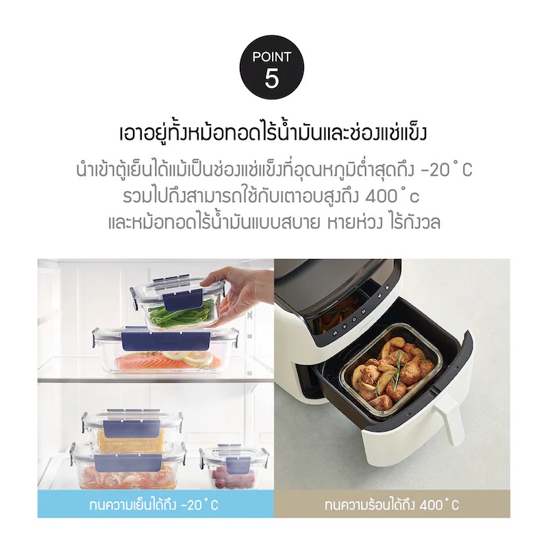 | Product Tips | Oven-safe (up to 400°C), freezer-safe (-20°C), compatible with air fryers, and can be heated in boiling water at 100°C Removable and heat-resistant silicone seal Stackable design Dishwasher-safe |