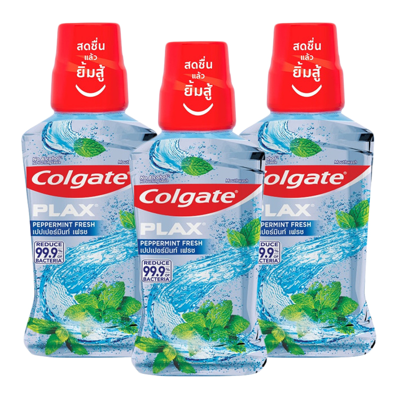 10 X times longer cooling * than brushing alone with 0% alcohol formula - no burn taste! Fresher smiles between brushings! - Reduce 99.9% of Bacteria** - Helps control bad breath and gives long-lasting fresh breath - Helps prevent cavities with Fluoride - better gum health*** - No burning sensation *from the study by Colgate - Palmolive USA 2017 **from clinical study in 28 volunteers age 18-64 years old, Mar - Apr 2014 by Colgate-Palmolive USA. When using after get up before brushing *** vs mouthwash with no antibacterial ingredient Enjoy a boost of confidence. Rinse with Colgate Plax twice a day after brushing! Fill the cap to the line (20ml) for one usage! Gargle for 30 seconds and split out. Do not swallow Colgate Plax Peppermint Fresh Mouthwash reduces bacteria accumulation and effectively controls bad breath for a long-lasting fresh breath - the best selling flavor of Colgate Plax!