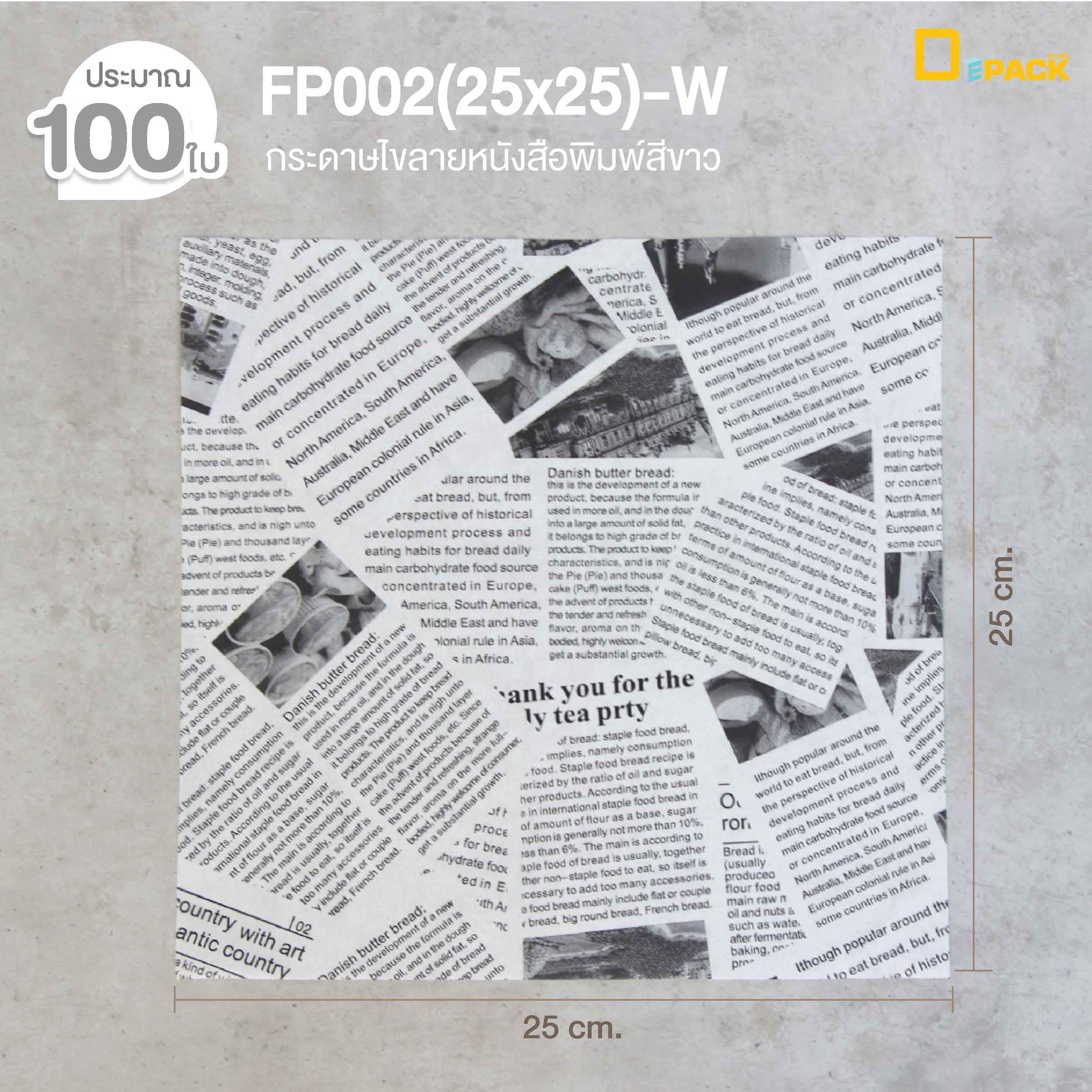 FP002(25x25)-W100 (สีขาว) กระดาษไขลายหนังสือพิมพ์ (1 แพ็ค/ ประมาณ 100 ใบ) กระดาษไขลายหนังสือพิมพ์ กระดาษซับน้ำมัน Food Grade เหมาะสำหรับใช้รองขนม ห่ออาหาร หรือ ห่อสินค้าได้ เพิ่มความพรีเมียมให้สินค้า ขนาด : กว้าง 25 x ยาว 25 ซม.