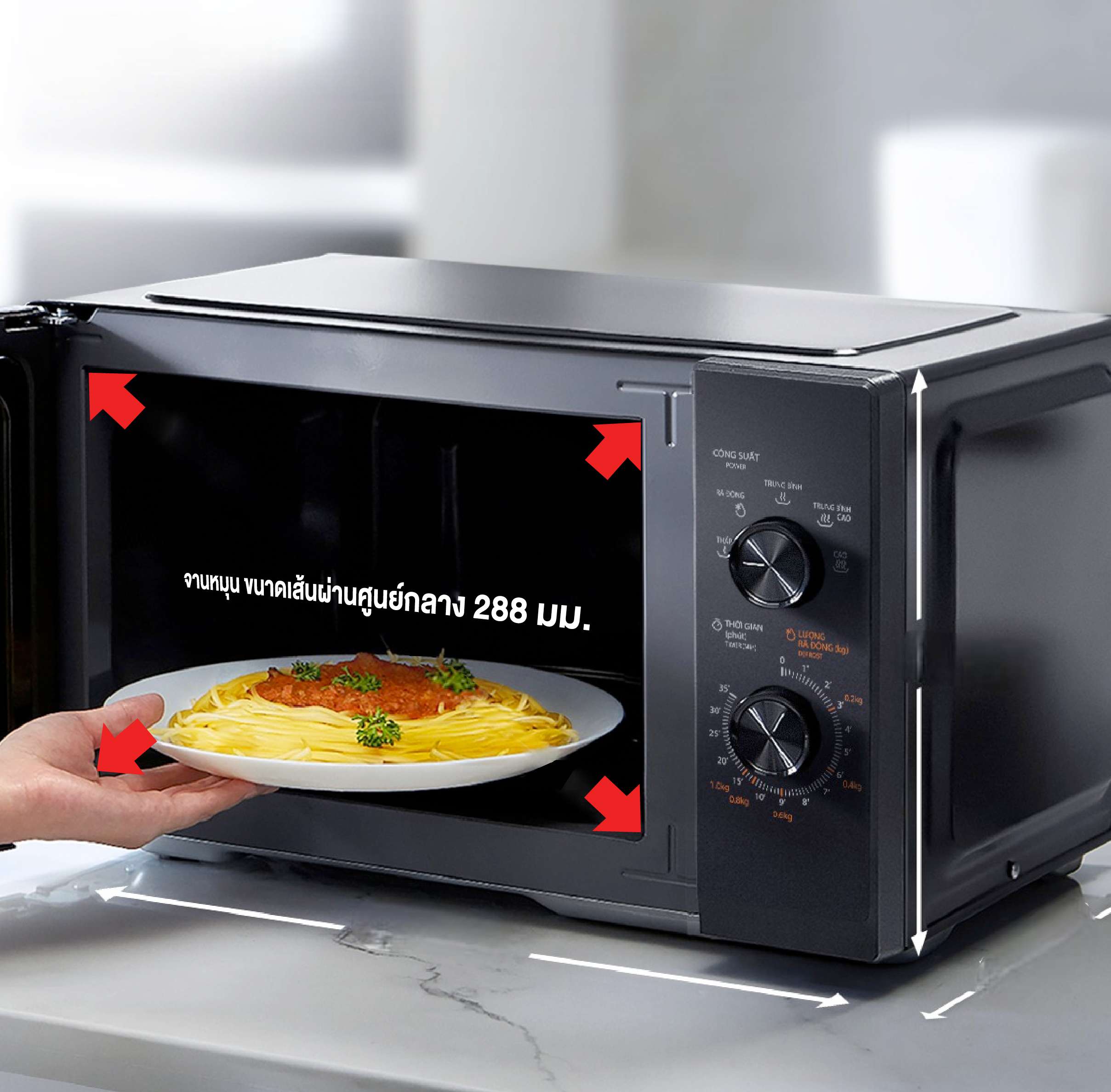 A 25-liter microwave oven that offers more space for your dishes, featuring a 288 mm turntable that can accommodate an 11-inch pizza. Its slim and space-saving design makes it perfect for compact kitchens or small countertop areas.