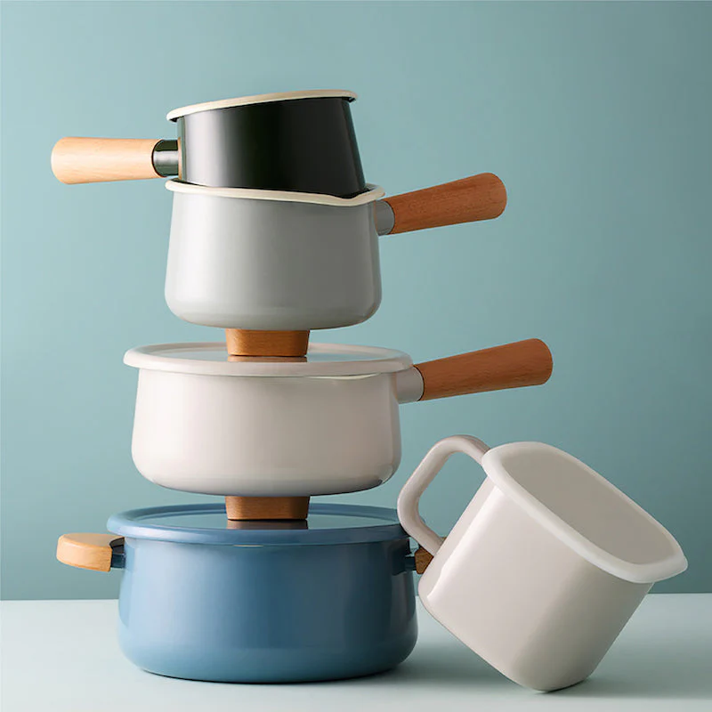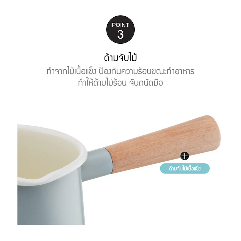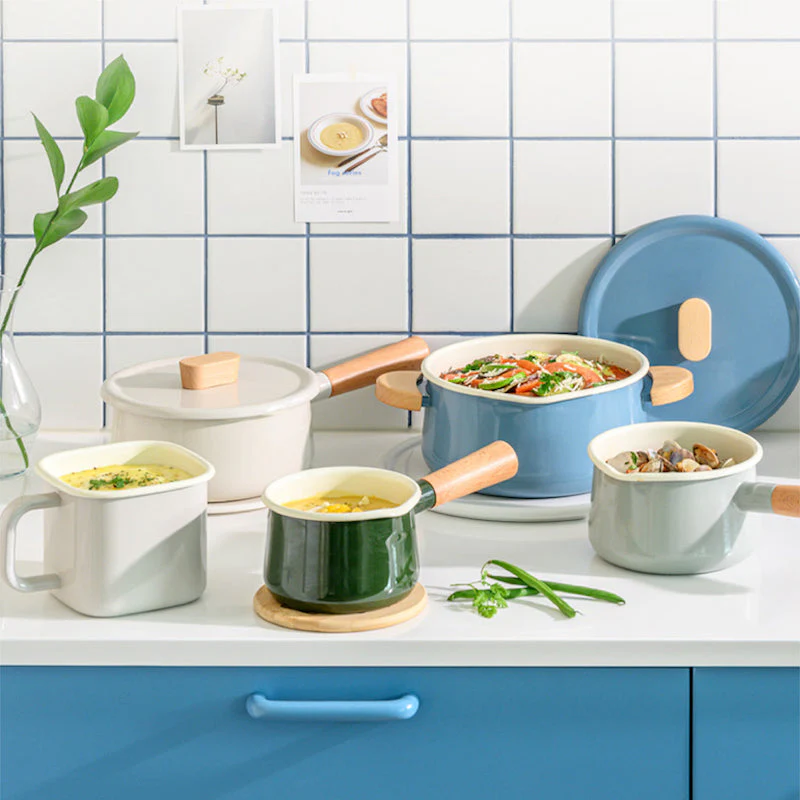 Body: Enamel-coated Steel Handle & Side Handles: Hardwood Lid: PE Plastic