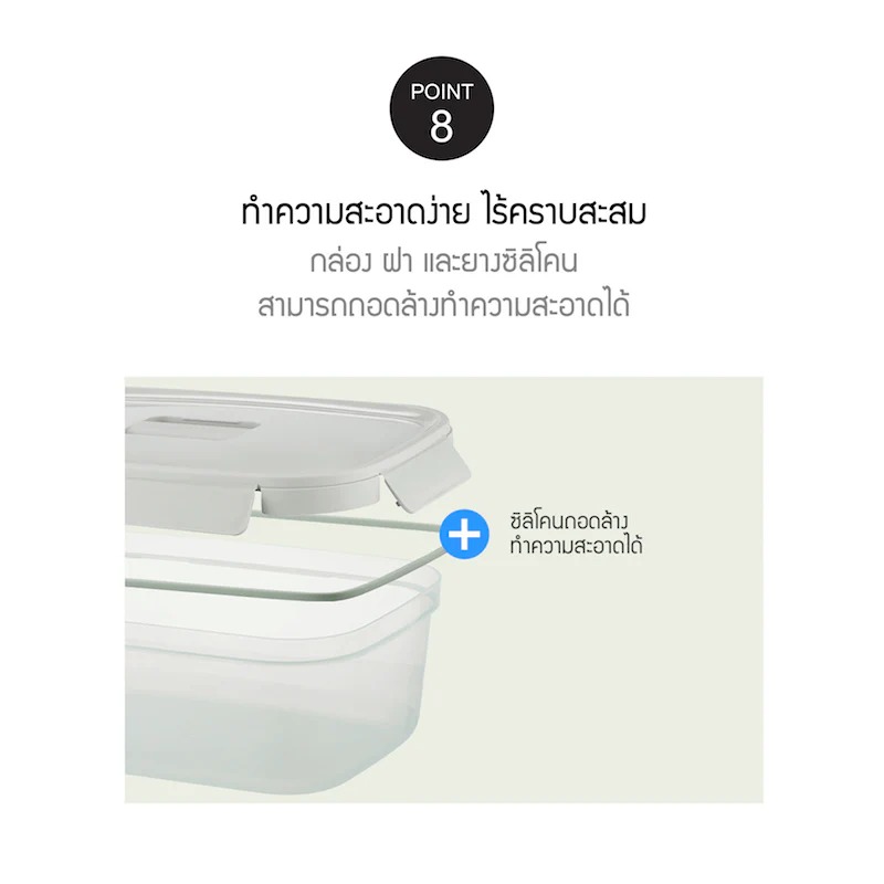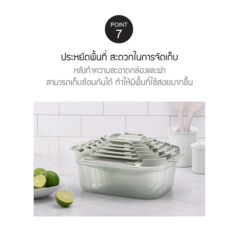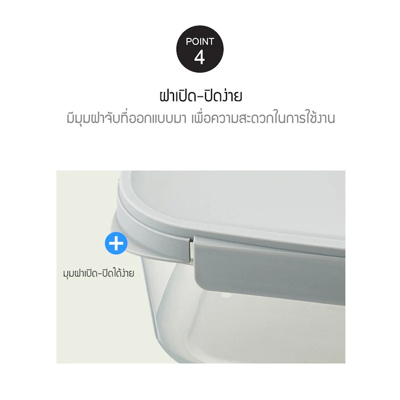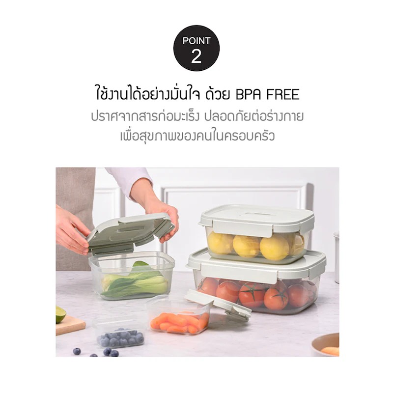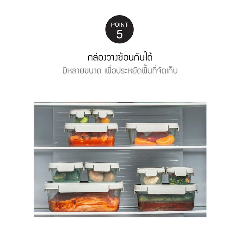 | Product Tips | Clear capacity indicators Easy-to-open lid with a corner tab for added convenience Matching model markings on both lid and container Space-saving, stackable design Easy to clean, stain-free, and odor-free |