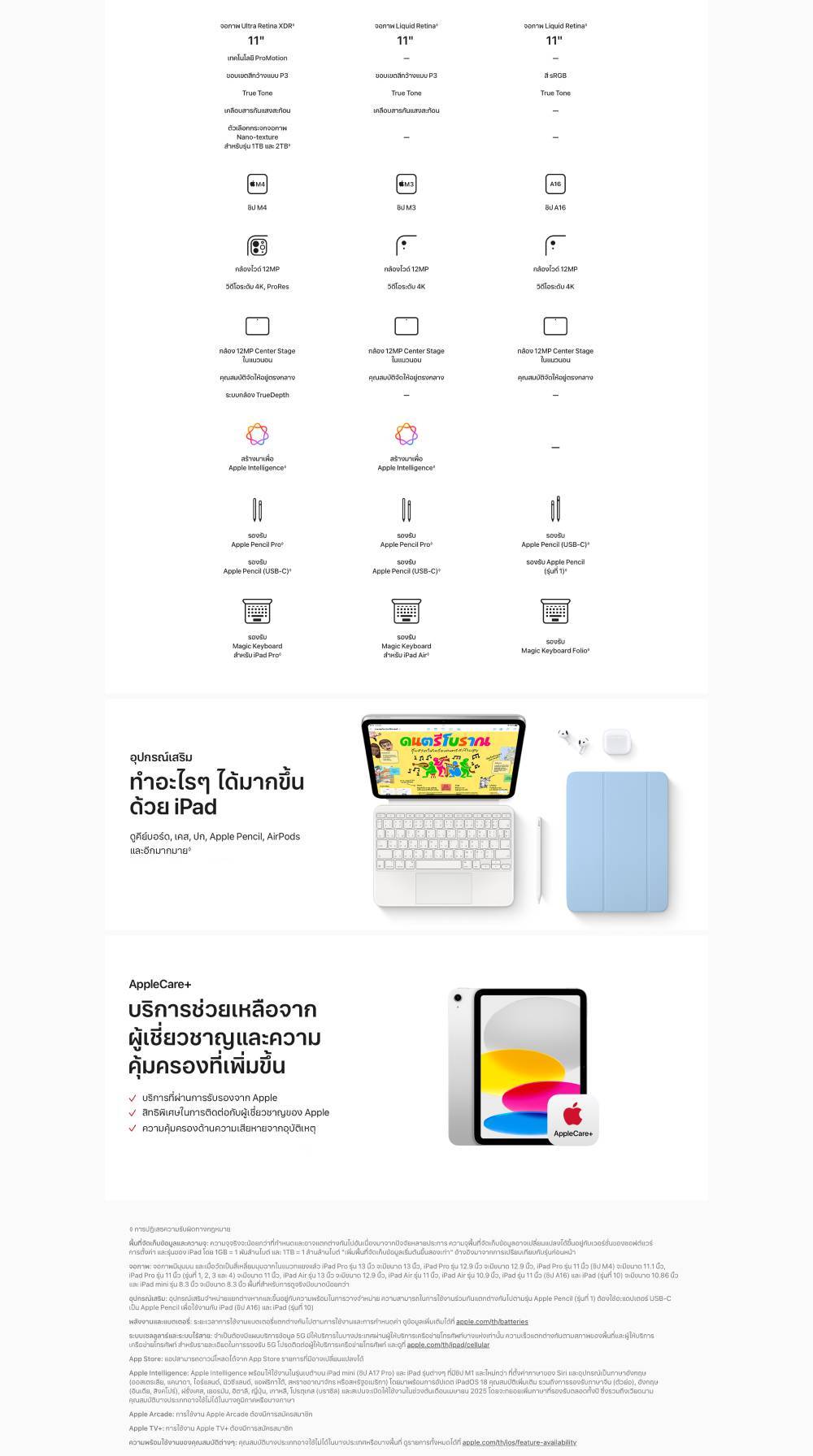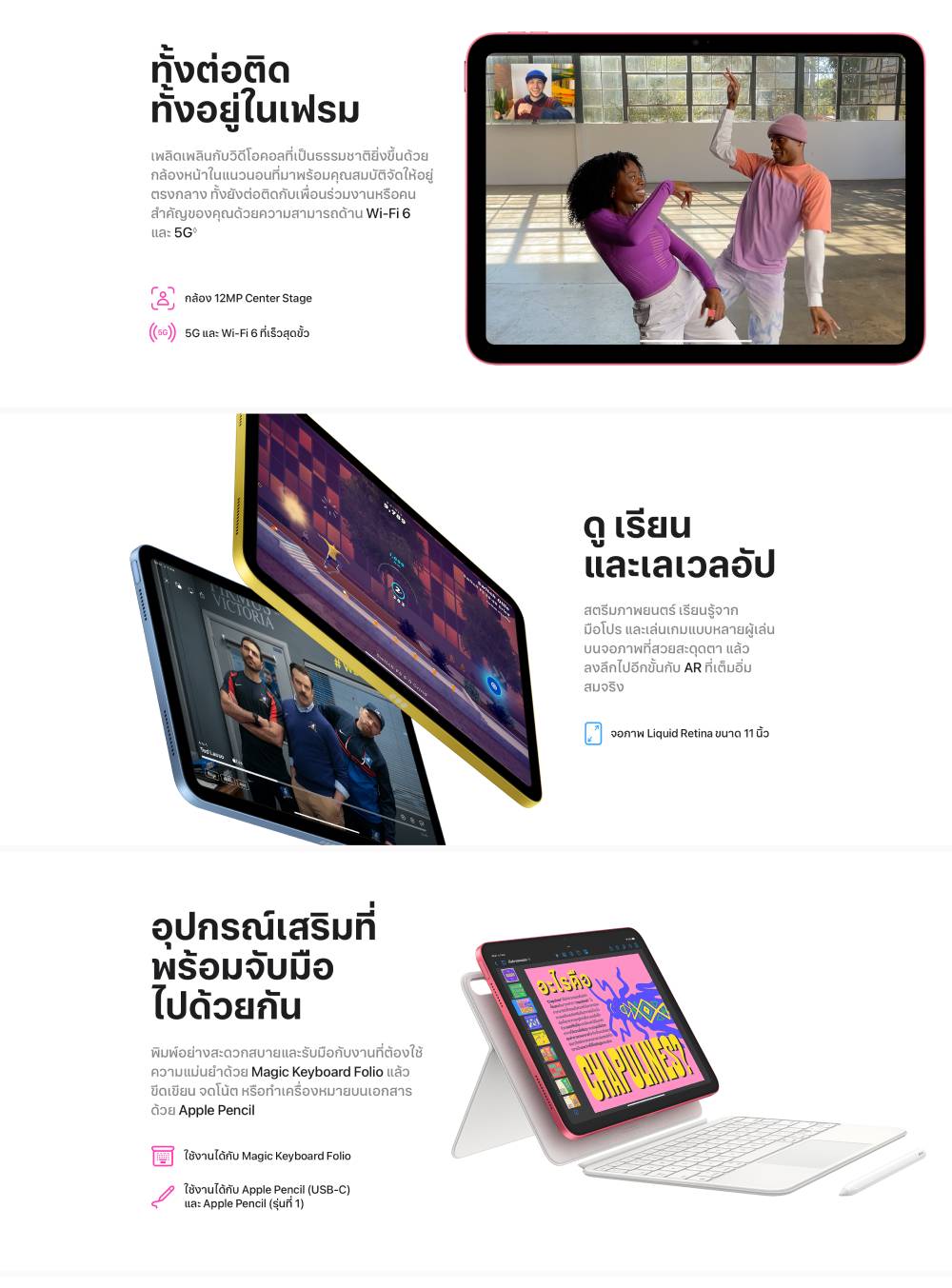 • APPLE PENCIL และ MAGIC KEYBOARD FOLIO—Apple Pencil (USB-C) พลิกโฉม iPad ให้กลายเป็นผืนผ้าใบที่สมจริงสำหรับการวาดภาพและเป็นอุปกรณ์สำหรับจดโน้ต ส่วน Magic Keyboard Folio ก็มาในดีไซน์แบบสองชิ้นสุดอเนกประสงค์ที่ประกอบด้วยคีย์บอร์ดแบบถอดแยกได้และแผงปกป้องที่ด้านหลังตัวเครื่อง โดยทั้งคู่จะยึดติดกับ iPad ด้วยแม่เหล็ก โดย Apple Pencil (รุ่นที่ 1) นั้นสามารถใช้งานร่วมกับ iPad ได้*5