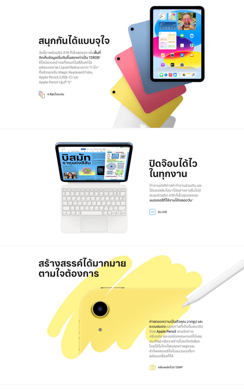 iPad รุ่น 11 นิ้ว วันนี้มากความสามารถยิ่งกว่าที่เคยด้วยชิป A16 ที่เร็วสุดแรง, จอภาพ Liquid Retina,*1 กล้องที่ล้ำหน้า, Wi-Fi 6 ช่องต่อ USB-C และ 4 สีสันสวยสะดุดตา บอกเลยว่า iPad คือวิธีอันทรงพลังที่จะช่วยให้คุณสร้างสรรค์ ต่อติดกับทุกเรื่องเสมอ และทำนู่นทำนี่ให้เสร็จได้ ซึ่งทั้งหมดนี้มาในราคาที่เป็นเจ้าของได้ง่ายๆ จนคุณต้องแปลกใจ