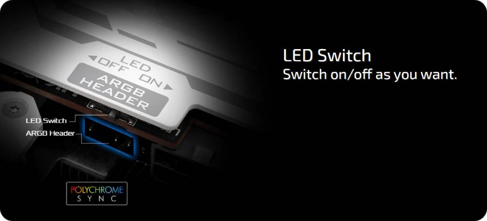 สร้างเอฟเฟกต์แสงสีสันอันเป็นเอกลักษณ์ของคุณเอง ด้วยไฟ LED ARGB ในตัว คุณสามารถสร้างเอฟเฟกต์แสงสีสันเฉพาะตัวของคุณเองได้ ซึ่งสามารถเปิดหรือปิดได้ นอกจากนี้ยังสามารถซิงโครไนซ์กับเมนบอร์ด ASRock ที่รองรับ Polychrome SYNC ได้อีกด้วย