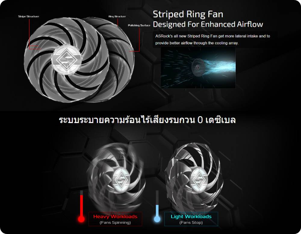 เทคโนโลยีทำความเย็นเงียบ 0 เดซิเบล ทำให้พัดลมหยุดหมุนหากใช้งานน้อย แม้ไม่ทำให้เกิดเสียงรบกวนเมื่อทำงานหนัก