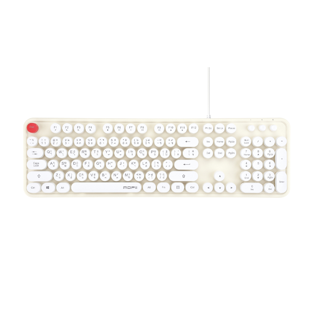 คีย์บอร์ดเชื่อมต่อด้วยสาย USB ใช้งานได้กับทั้งระบบ Window / iOS ดีไซน์ปุ่มเป็นทรงกลม โค้งมนคล้ายปุ่มพิมพ์ดีดสมัยก่อน ดูแปลกตาแต่สวยงาม ทำปุ่มยกสูงขึ้นแยกจากตัวคีย์บอร์ด ลดการสะสมของฝุ่น และลดโอกาสที่สิ่งแปกลปลอมเข้าไปในตัวคีย์บอร์ด มี 104 standard keys พร้อมปุ่ม Function Key (ปุ่มF)12 ปุ่ม