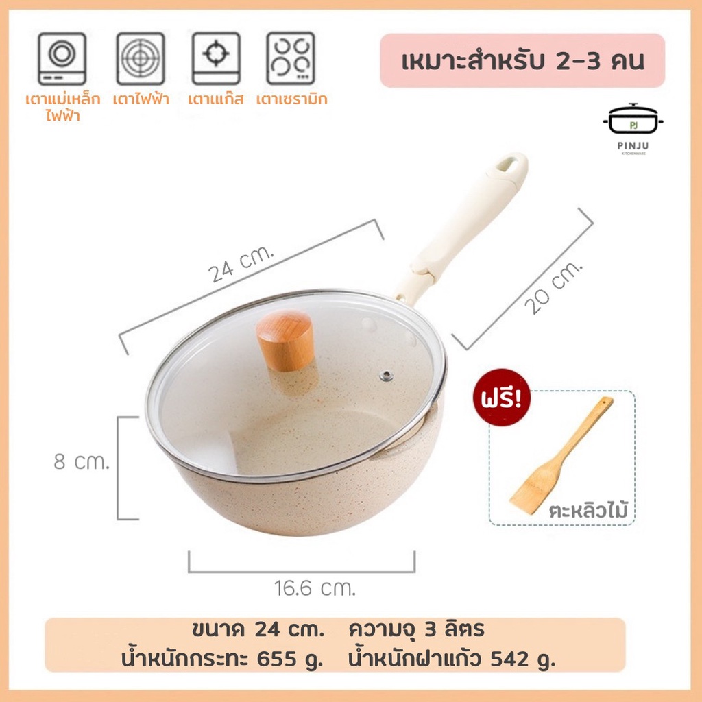 PINJU กระทะหินอ่อนก้นลึก non-stick (ครีม กระทะ+ฝา 24 cm.) กระทะเคลือบ กระทะก้นลึก กระทะเคลือบหินอ่อน กระทะหินอ่อน กระทะ