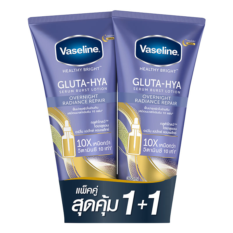 - ชื่อสินค้า: วาสลีน เฮลธี้ไบรท์ กลูต้าไฮยา เซรั่มเบิสท์ โลชั่น โอเวอร์ไนท์ เรเดียนซ์ รีแพร์ 300 มล. x 1+1 - แบรนด์: วาสลีน - ปริมาณบรรจุ: 2 หน่วย