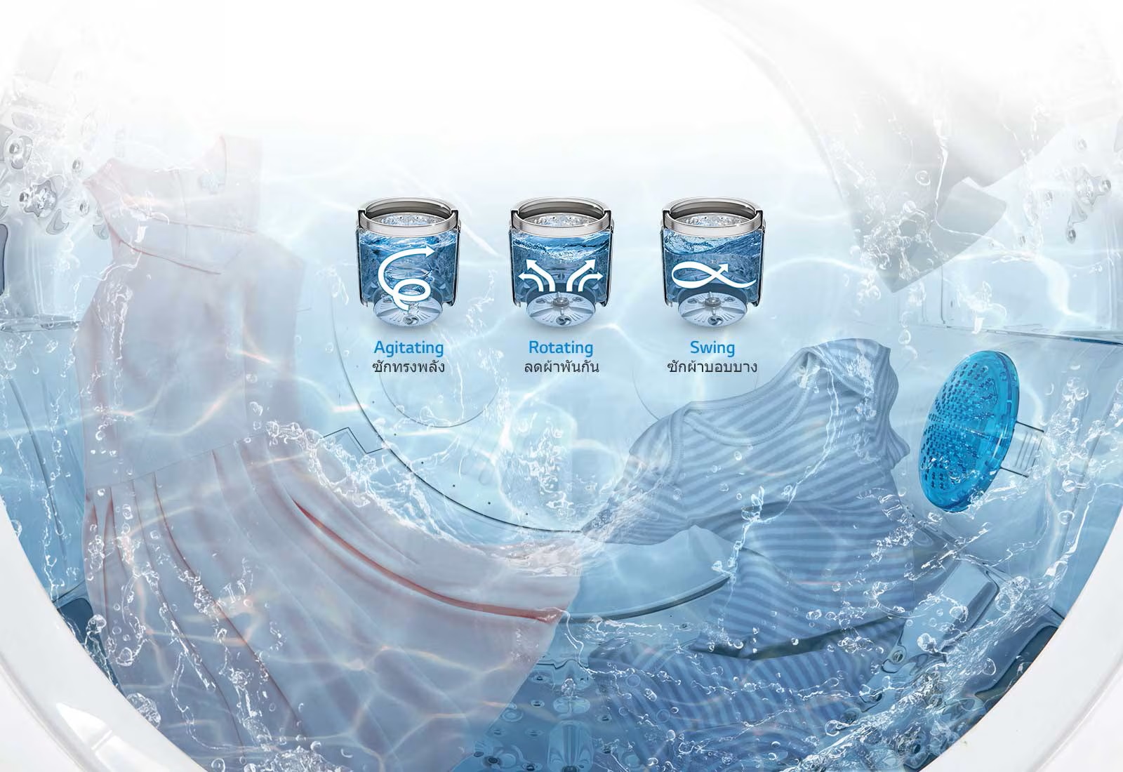 เครื่องซักผ้าฝาบน LG ออกแบบถังซักให้หมุนได้ 3 รูปแบบซึ่งควบคุมการทำางานด้วยระบบ Smart Inverter ช่วยเพิ่มประสิทธิภาพในการซักและถนอมผ้า