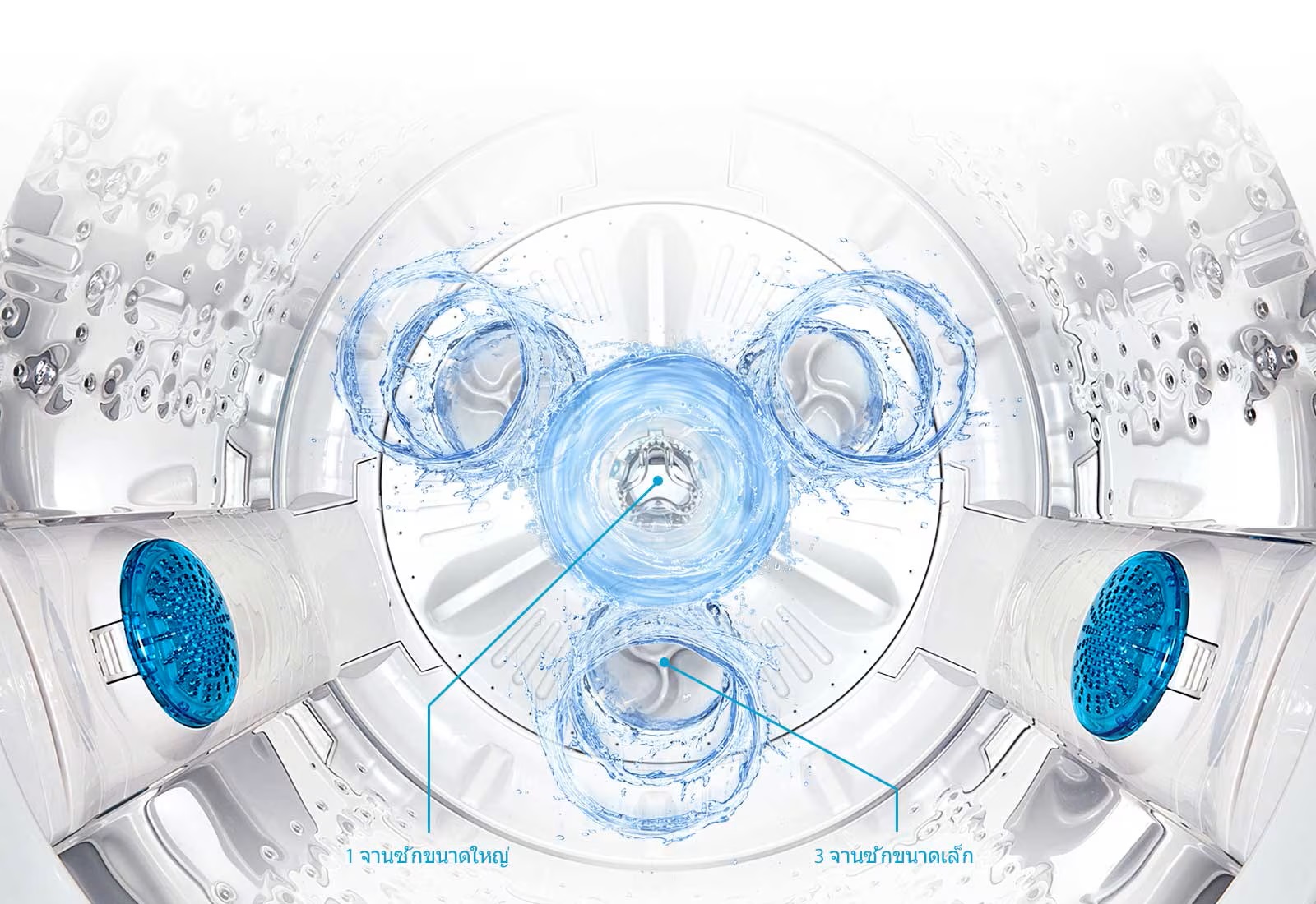 จานหมุนแบบ Punch 3 สร้างคลื่น น้ำแนวตั้งที่จะช่วยให้ผ้ากระจายตัว ออกจากกัน ช่วยเพิ่มประสิทธิภาพ ในการซัก
