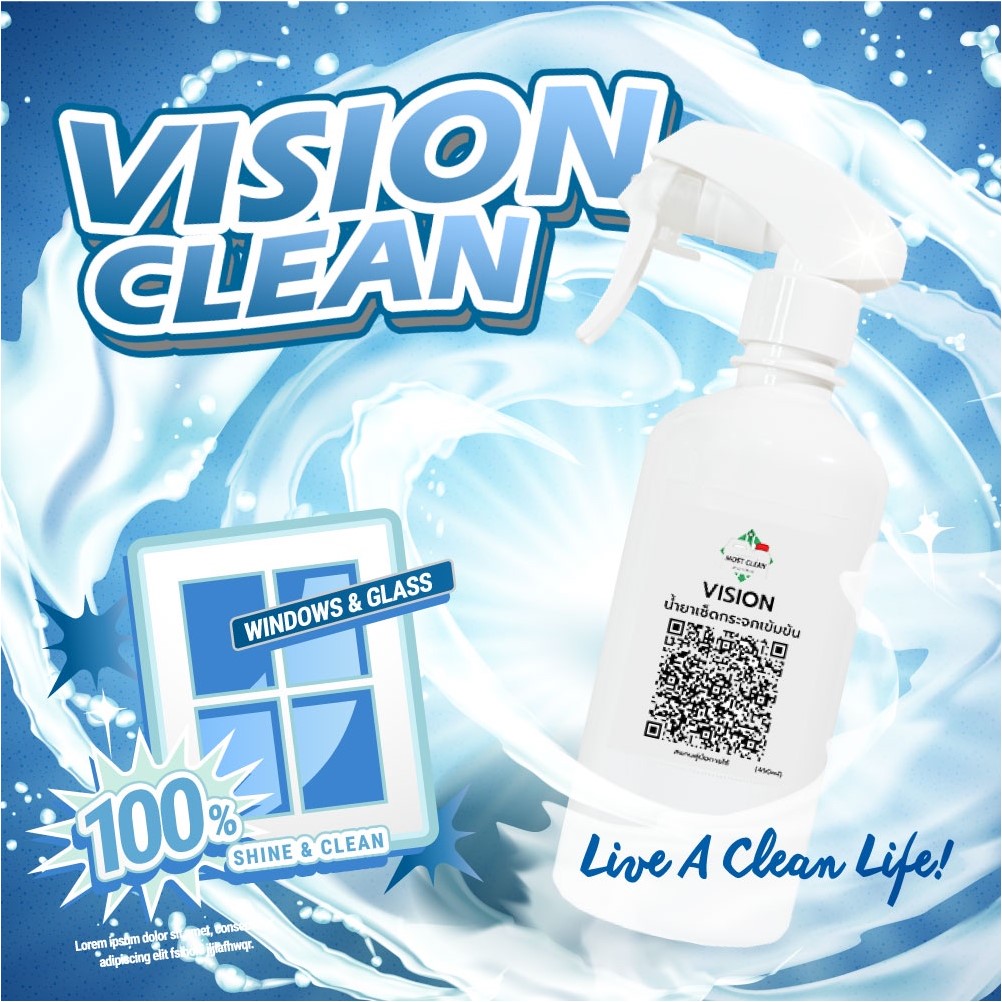 VISION น้ำยาเช็ดกระจก ใช้ในอุตสาหกรรมทำความสะอาดทั่วประเทศ หากไม่พอใจสินค้ายินดีคืนเงิน สินค้ามาตรฐานอุตสาหกรรม นำมาขายราคาครัวเรือน น้ำยาเช็ดกระจกอุตสาหกรรมใช้ในการทำความสะอาดกระจกอาคารสูง ที่ต้องน้ำยาทำความสะอาดคุณภาพสูงเพราะการปีนป่ายทำความสะอาดกระจกอาคารสูงแต่ละครั้งมีต้นทุนแพง จึงต้องมั่นใจกว่าการทำความสะอาดแต่ละครั้งกระจกต้องสะอาด ไม่มีคราบสกปรกหลงเหลือ และเคลือบผิวลดฝุ่นเกาะซ้ำ นอกจากนี้ยังใช้ในสำนักงาน ออฟฟิศ โรงงาน รถยนต์ ที่ต้องการผลิตภัณฑ์คุณภาพสูง ช่วยทำความสะอาดกระจกให้สะอาดใสเป็นประกาย ขจัดคราบสกปรก ฝุ่นละออง คราบมัน และคราบขุ่นมัว วิธีใช้ 1. เท วิชั่น ใส่กระบอกฉีดโดยไม่ต้องผสมน้ำ 2. ฉีดลงบนผิวที่ต้องการทำความสะอาด ปรับหัวฉีดให้เป็นฝอย โดยถือกระบอกฉีดให้ห่างจากกระจกประมาณ 20 ซม. 3. เช็ดออกด้วยผ้าแห้ง หรืออุปกรณ์กรีดกระจก (ถ้ากระจกสกปรกมากให้ฉีดซ้ำ ทิ้งไว้ 1-2นาที แล้วเช็ดออกด้วยผ้าแห้งหรืออุปกรณ์กรีดกระจก สารประกอบหลัก 1. Lsopropyl alcohol 12.0 %w/w 2. Ethylene glycol n-butyl ether 1.2 %w/w 3. Sodium lauryl ether sulfate 0.2%w/w 4. Ammonium hydroxide 0.1%w/w 5. Etc. หมายเลข อย: วอส.1073/2554 Properties: Vision is a glass cleaner, effective on any glass surface and other surfaces i.e. Refrigerator, Gas stove, Ceramic, Chromium, Stainless, etc. Vision provide ability in cleaning, cutting grease and removing dirt and soil. Give the glass surface clean and clear Direction for use: 1. Pour undiluted Vision into trigger sprayer. 2. Apply Vision to the surface to be cleaned by adjusting nozzle position to be spray and hold the trigger sprayer away from surface about 20 cm. 3. Wipe the surface with dry cloth or squeegee. (For Heavy soil, repeated apply Vision to the surface and leave for 1-2minutes, then wipe the surface with dry cloth or sqyeegee) ผลิตภัณฑ์ทำความสะอาดคุณภาพสูงจาก MostClean 1.ผลิตภัณฑ์ซักผ้า 1.1 น้ำยาซักผ้าสูตรเข้มข้น Compak 1.2 น้ำยาซักผ้ามาตรฐานระดับโรงแรม Target 1.3 ผงซักฟอกสูตรเข้มข้น Zyrex 1.4 น้ำยาปรับผ้านุ่มโรงแรม Mono Soft 1.5 น้ำยาป้ายผ้า ขจัดคราบไคลและไขมัน Booster-K 1.6 ผงขจัดคราบฝังแน่น Color White 1.7 น้ำยาแช่ผ้าฆ่าเชื้อ Xylon 1.8 น้ำหอมฉีดผ้า Fresh Up 1.9 น้ำยาขจัดสนิมผ้า Rust Out 2. ผลิตภัณฑ์ห้องครัว 2.1 น้ำยาล้างจาน Yuki 2.2 น้ำยาล้างเตา ไขมันและคราบไหม้ Champ 2.3 ผงขจัดคราบดำ คราบฝังแน่นบนจาน Soak-It 3. ผลิตภัณฑ์ห้องน้ำ 3.1 น้ำยาล้างห้องน้ำสูตรเข้มข้น Hypro plus 3.2 ผงขัดคราบสุขภัณฑ์ในห้องน้ำ Surface 4. ผลิตภัณฑ์เฉพาะพื้นผิว/อื่นๆ 4.1 น้ำยาดันฝุ่นสูตรเข้มข้น Mop Up 4.2 น้ำยาทำความสะอาดและเคลือบเงาพื้นผิว Blue Shine 4.3 น้ำยาล้างเครื่องเงิน Silver-K 4.4 น้ำยาเช็ดกระจกเกรดอุตสาหกรรม Vision 4.5 น้ำยาทำความสะอาดอเนกประสงค์ Bubble 5. ผลิตภัณฑ์ฆ่าเชื้อ 5.1 น้ำยาฆ่าเชื้อดับกลิ่นสูตรเข้มข้น Xylon 5.2 น้ำยาฆ่าเชื้อดับกลิ่นมาตรฐานอุตสาหกรรม Citrodet 5.3 น้ำยาฆ่าเชื้อ Food Grade Kovitex-85 6. ผลิตภัณฑ์ล้างมือ 6.1 สบู่เหลวล้างมือ Probac 6.2 สบู่โฟมล้างมือ Probac Foam