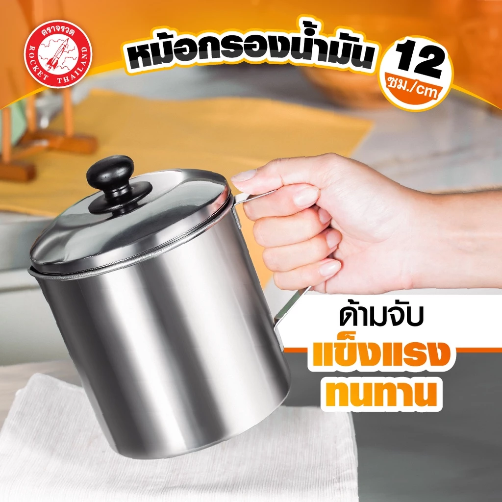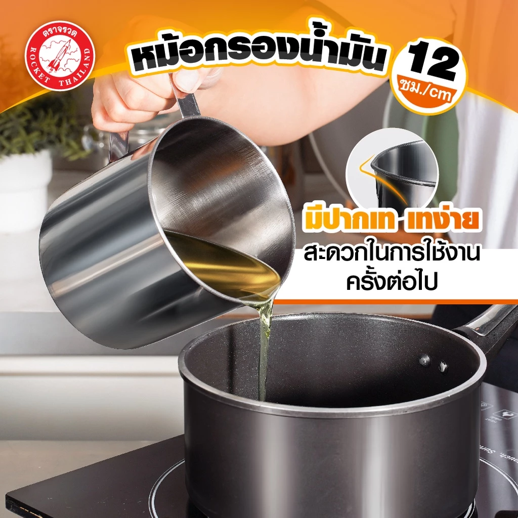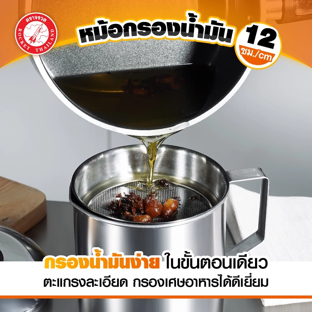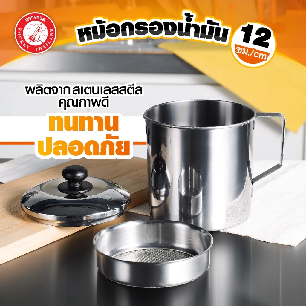 ซีกัล หม้อกรองน้ำมัน 12 ซม.. ใช้กรองน้ำมัน เพื่อยืดอายุการใช้ซ้ำ ผลิตจากสแตนเลสมีคุณภาพ กรองเศษอาหารชิ้นเล็กๆ ที่เกิดขึ้นในระหว่างการทอดได้เป็นอย่างดี มีหูจับถนัดมือ มีปากเทเพื่อสะดวกในการใช้งาน ตะแกรงกรองสามารถแยกกากกับของเหลวออกจากกัน ช่วยให้เก็บน้ำมันใช้ได้นานขึ้น สามารถนำไปใช้กรองเครื่องดื่มอื่นๆ ได้ เคลือบผิวด้านนอกด้วย Xylac จาก Whitford USA ไม่เป็นอันตรายเมื่อโดนเปลวไฟและความร้อน ปราศจากโลหะหนัก เช่น สารตะกั่ว แคดเมียม ปลอดภัยต่อสุขภาพ ช่วยให้การปรุงอาหารทำได้ง่ายขึ้น ไม่ต้องใช้ไฟแรง ใช้น้ำมันน้อย สามารถใช้ได้กับเตาแม่เหล็กไฟฟ้า และ เตาทุกประเภท  สินค้าประกอบด้วย 1.หม้อกรองน้ำมันขนาด 12 ซม.. 2.ฝาหม้อกรองน้ำมันขนาด 12 ซม.. 3.ตะแกรงกรองน้ำมัน วิธีการดูแลรักษา ไม่ควรแช่หรือสัมผัสกรดหรือเกลือหรือด่างเข้มข้น เช่น น้ำปลา น้ำมะนาว น้ำส้มสายชู ไม่ควรใช้ฝอยเหล็กขัดทำความสะอาด ควรใช้ฟองน้ำในการทำความสะอาดและเช็ดให้แห้งทันทีหลังการใช้งาน ห้ามใช้กับเตาไมโครเวฟ