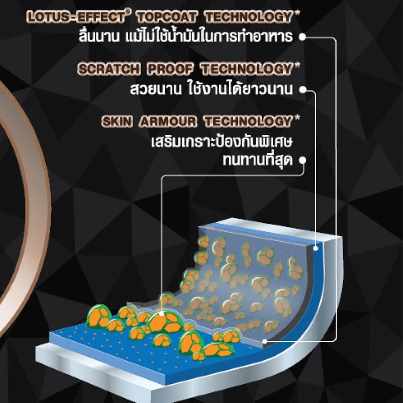 - เทคโนโลยี Lotus-Effect® Topcoat Technologyการเคลือบผิวชั้นบน ที่ทำให้กระทะลื่น เสมือนน้ำกลิ้งบนใบบัว