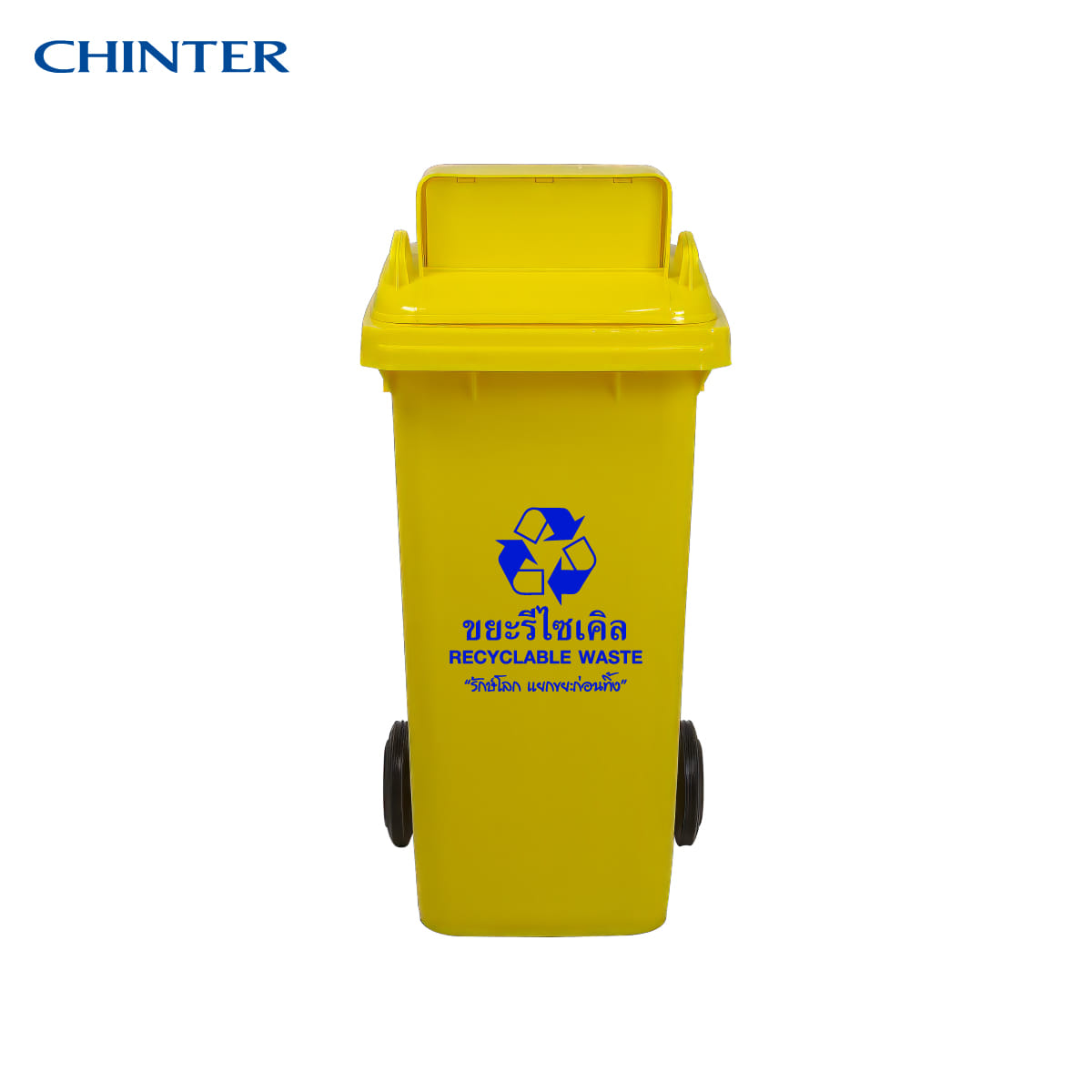 ถังขยะพลาสติก สีเหลือง มีล้อ ฝาสูง 120 ลิตร สกรีนขยะรีไซเคิล - CHINTER F003-4-S946-C01H สกรีน