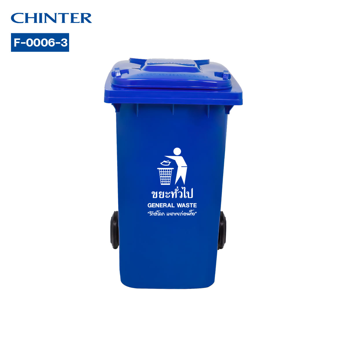 ถังขยะพลาสติก สีน้ำเงิน มีล้อ ฝาเรียบ 240 ลิตร สกรีนขยะทั่วไป - CHINTER F006-3-S946-C02L สกรีนทั่วไป