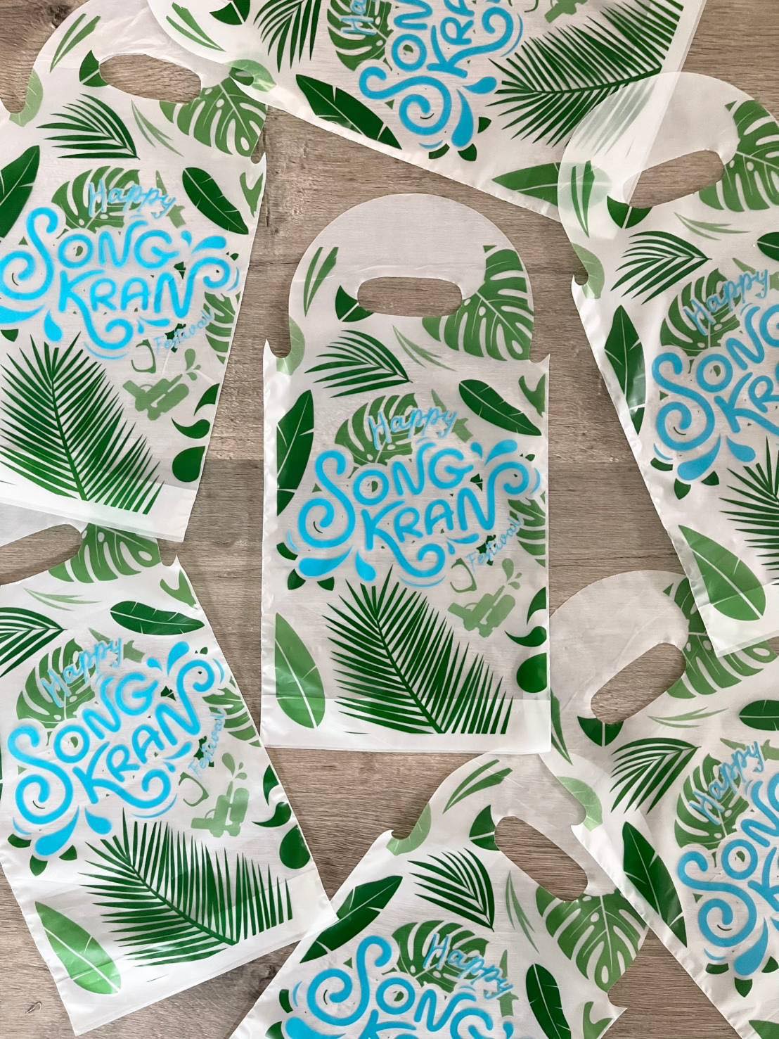ถุงคัทเอาท์หิ้วแก้วเต็มใบเนื่้อHD 16-22ออนซ์ ลายสงกรานต์ บรรจุห่อละ 6 แพค แพค 100 ใบ สำหรับหิ้วแก้วเครื่องดื่ม