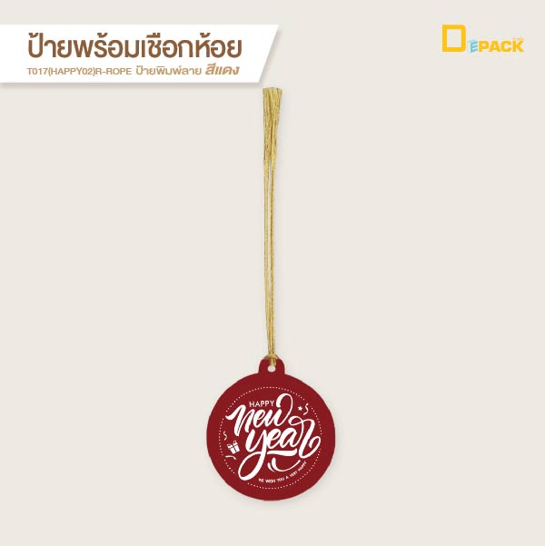 Depack T017(HAPPY02)-R(Rope)(สีแดงเชือก) ป้ายห้อยสินค้าทรงกลมพิมพ์ลาย Happy new year (1 แพ็ค/ 50 ใบ)