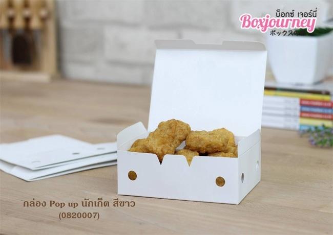 กล่องใส่ไก่ทอด สีขาว ขนาดสินค้า กว้าง 9 x ยาว 13 x สูง 4.5 cm. จำนวน 50 ใบต่อแพ็ค ราคา 175 บาทต่อแพ็ค เหมาะสำหรับนำไปใส่นักเก็ต ไก่ทอด แฟรนฟรายด์ ตัวกล่องมีรูระบายความความร้อนทั้ง 4 มุม ผลิตจากกระดาษฟู้ดเกรด