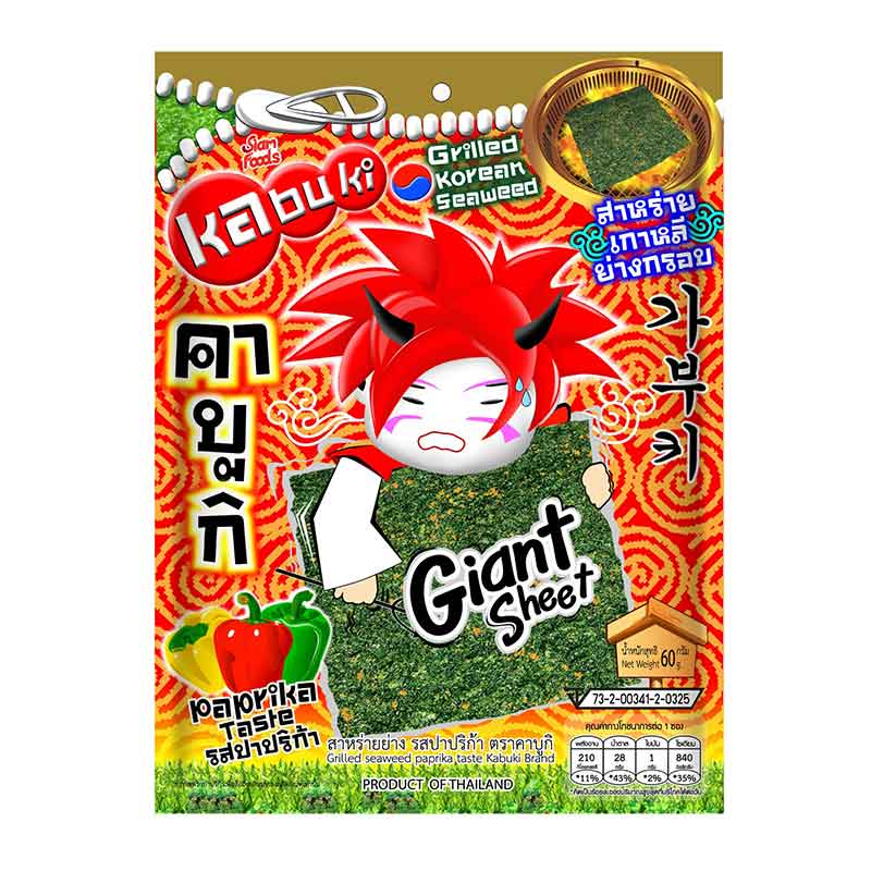 - ชื่อสินค้า: คาบูกิ สาหร่ายเกาหลีย่างกรอบ รสปาปริก้า 50 กรัม - แบรนด์: คาบูกิ - ปริมาณบรรจุ: 1 ชิ้น