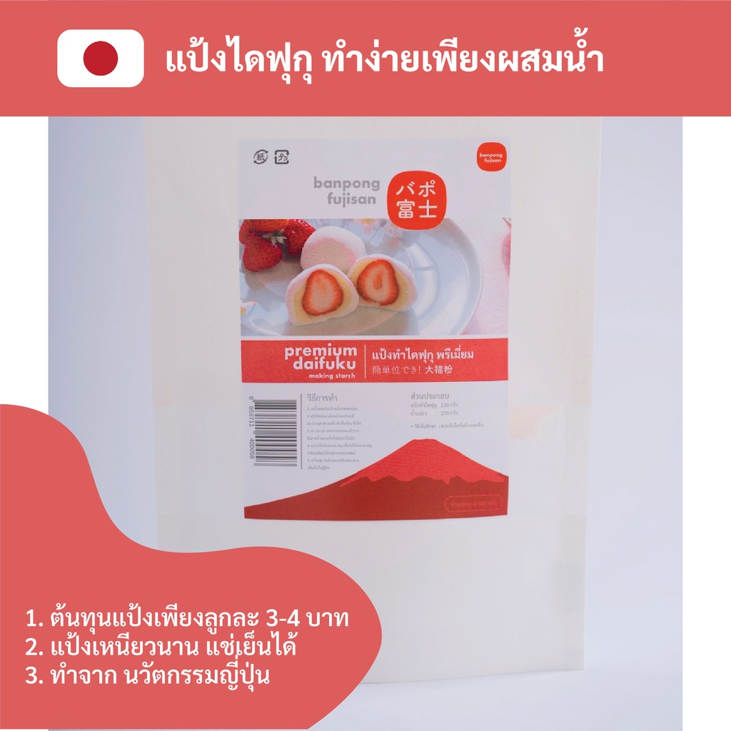 แป้งไดฟุกุ สำเร็จรูป พรีเมี่ยม ตรา บ้านโป่ง ฟูจิ ซัง ทำง่ายมากๆ เพียงใส่น้ำ และตั้งไฟเบาๆ กวนๆ ปริมาณ 500 กรัม ปั้นได้ 46-55 ลูก (ตกลูกละ 3-4 บาท) วิธีทำ 1.เทแป้งปริมาณ ลงในภาชนะ 2.ผสมน้ำเดือดจัด ปริมาณ 1 ต่อ 1 กับแป้ง ลงในภาชนะ 3. ใช้ไม้พายคนให้เข้ากับ ใช้เวลาประมาณ 8-10 นาที สังเกตุว่าเนื้อเนียนเข้ากันแล้วจึงหยุด 4. แบ่งแป้งตามปริมาณที่ต้องการ ห่อไส้สะดวกสบาย น้ำหนัก : 500 กรัม วิธีเก็บรักษา : เก็บไว้ในที่แห้ง ในอุณหภูมิห้อง