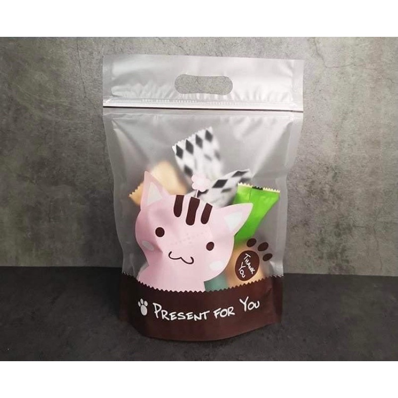 Ks Bakery ถุงซิปล็อคแบบมีหูหิ้ว ตั้งได้ หิ้วได้ แมวpresent แพ็ค 50 ใบ (+-3 ใบ)