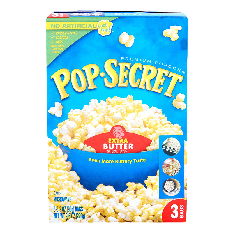 - ชื่อสินค้า: ป๊อป ซีเคร็ท เมล็ดข้าวโพดดิบสำหรับไมโครเวฟ กลิ่นเนย 270 ก. - แบรนด์: ป๊อป ซีเคร็ท - ปริมาณบรรจุ: 1 หน่วย ส่วนประกอบ: เมล็ดข้าวโพด 65% น้ำมันปาล์ม 30% เกลือ 3.6% สีธรรมชาติ (INS 160b(i)), สีสังเคราะห์ (INS 160c(ii) วัตถุเจือปนอาหาร (INS 270) แต่งกลิ่นธรรมชาติ ข้อมูลผู้แพ้อาหาร: มีนม สำหรับผู้ที่ต้องจำกัดการบริโภคไอโอดีน ข้อมูลการเก็บรักษา: ไม่ควรเก็บไว้ในที่ร้อนจัดหรือสัมผัสแสงแดด