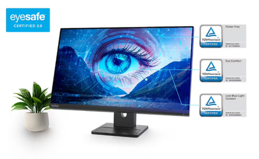 จอภาพ ThinkVision E24-30 จะมาพร้อมกับเทคโนโลยี Natural Low Blue Light ซึ่งได้รับการรับรองจาก TUV เพื่อป้องกันสายตาของคุณ ขณะที่ Hardware Solution จะลดแสงสีฟ้าอย่างได้ผลโดยไม่ทำให้สีสันผิดเพี้ยนไป