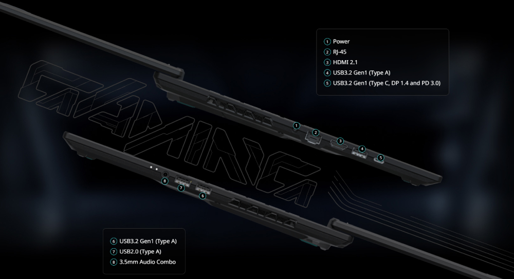 • Connection ports : 1x USB-A (USB 5Gbps / USB 3.2 Gen 1), 1x USB-A (USB 5Gbps / USB 3.2 Gen 1), Always On, 2x USB-C (Thunderbolt 4 / USB4 40Gbps), with USB PD 3.0 and DisplayPort 2.1, 1x HDMI 2.1, up to 8K/60Hz, 1x Headphone / microphone combo jack (3.5mm), 1x SD card reader