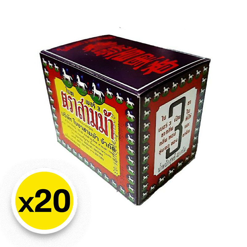 - ชื่อสินค้า: ชาสามม้า ใบชา เบอร์ 3 40 ก. x 20 - แบรนด์: ชาสามม้า - ปริมาณบรรจุ: 20 หน่วย ข้อมูลการเก็บรักษา: ควรเก็บในที่แห้งและเย็น และหลีกเลี่ยงแสงแดดและความชื้น