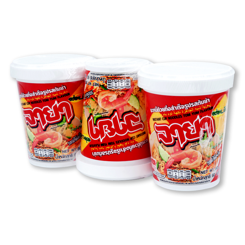 - ชื่อสินค้า: จายาคัพ บะหมี่กึ่งสำเร็จรูป รสต้มยำ 60 กรัม x 3 ถ้วย - แบรนด์: จายา - ปริมาณบรรจุ: 3 ชิ้น