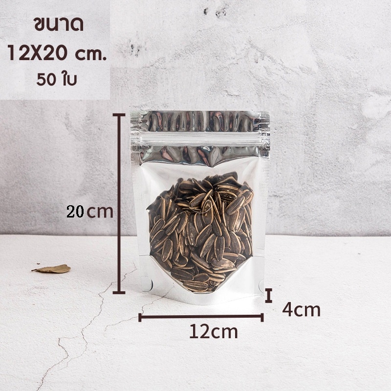 Matapat ถุงฟอยด์เงิน (12x20 (บรรจุ50ใบ)) ถุงซิปล็อคตั้งได้ ด้านหน้าใสหลังเงิน ถุงฟอยด์สีเงิน ถุงขนม ซองขนม (บรรจุ50ใบ)