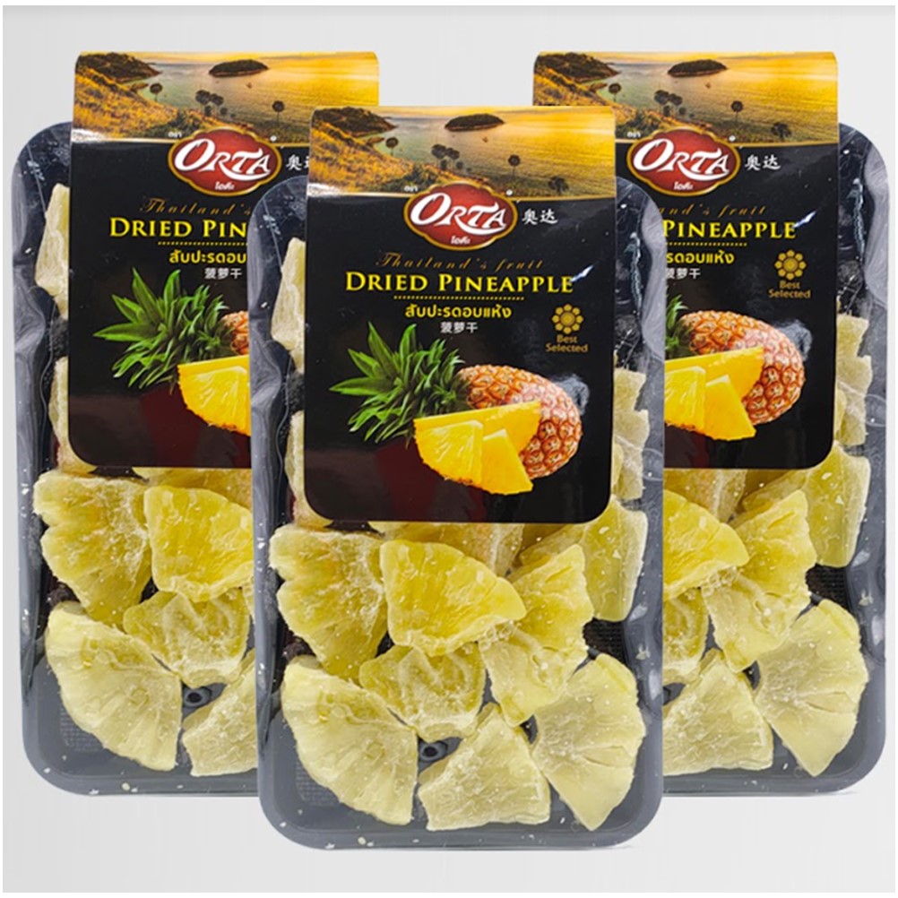 สับปะรดชิ้นอบแห้ง หอม หวาน อร่อย น้ำหนัก : 150g อายุการเก็บรักษา : 12 เดือน (1ปี) เลขที่จดแจ้ง (อย.) : 83-2-02246-2-0079 ส่วนประกอบสำคัญ : สับปะรด (Pineapple) 82% น้ำตาล (Cane Sugar) 18%