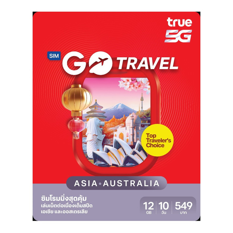 "True GO Travel SIM (Asia & Australia) 12GB 10 วัน ซิมโรมมิ่งที่คุ้มที่สุด ฟรี! ประกันการเดินทาง [*ลงทะเบียนซิมในไทยก่อนเดินทางเท่านั้น]