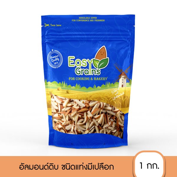 Easy Grains อัลมอนด์ดิบ ชนิดแท่งมีเปลือก Raw Blanched Silvered With Skin Almonds 1 กิโลกรัม
