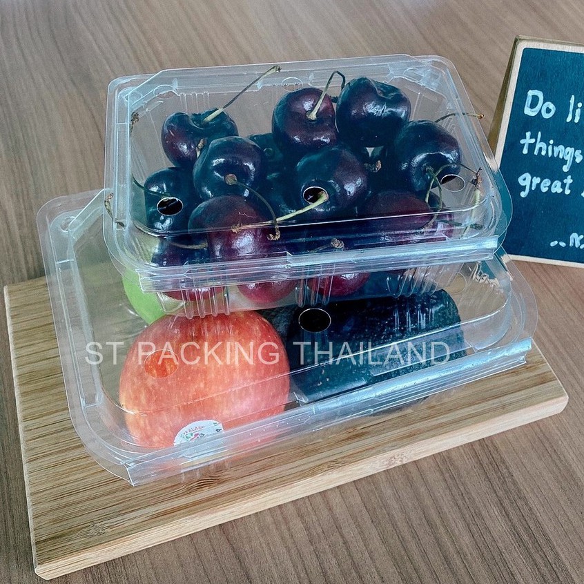 กล่องใส่ผลไม้เจาะรู วัสดุ : PET >> ใส เหนียว แข็ง ขนาด : 250 / 500 / 1,000 กรัม --------------------------------------------------- จำนวนชิ้น/แพ็ค 250 กรัม = 50 ชิ้น 500 กรัม = 50 ชิ้น 1,000 กรัม = 25ชิ้น --------------------------------------------------- ขนาดของสินค้า กล่อง 250กรัม = 7.5 x 10 x 4 ซม. (ก*ย*ส) กล่อง 500กรัม = 10 x 14.5 x 5.5 ซม. (ก*ย*ส) กล่อง 1000กรัม = 12.5 x 15.5 x 7 ซม. (ก*ย*ส) --------------------------------------------------- เหมาะสำหรับ - สตอเบอร์รี่ / อินทผาลัม / ทุเรียน / มังคุด / ผลไม้เมืองหนาว / ผลไม้มูลค่าสูง --------------------------------------------------- ข้อดีของกล่องเจาะรู - ไม่ก่อให้เกิดไอน้ำจับกับกล่องบรรจุภัณฑ์ - ช่วยให้กลิ่นของผลไม้ หอมฟุ้งได้เต็มที่ - ป้องกันสินค้าเกิดความร้อนจนเกินไป - เวลาแช่เย็น ความเย็นสามารถเข้าไปในสินค้าได้อย่าง เต็มที่ --------------------------------------------------- รายละเอียดการจัดส่ง สินค้า --> มีสินค้าพร้อมส่ง จัดส่งรวดเร็ว ทุกวันจันทร์ - เสาร์ --> สินค้าทุกชิ้นผ่านการตรวจสอบคุณภาพแล้ว --> หากพบปัญหา ทางร้านเรามี Admin คอยให้บริการ 7.30น.-17.00น. --> จัดส่งโดย ขนส่ง Best Express / Kerry / J&T --> มีบริการเก็บเงินปลายทาง (COD) ****************************************** *** โปรดอ่านก่อนสั่งซื้อ *** • ทางร้านไม่สามารถแก้ไขข้อมูลชื่อ ที่อยู่ เบอร์โทรคุณลูกค้า หลังได้รับคำสั่งซื้อเข้ามาในระบบ กรุณาตรวจสอบข้อมูลให้ถูกต้องก่อนการกดสั่งซื้อสินค้าทุกครั้ง หากข้อมูลผิด รบกวนทำการยกเลิกออเดอร์แล้วสั่งซื้อเข้ามาใหม่นะคะ • ทางร้านไม่รับเปลี่ยนหรือคืนทุกกรณี ยกเว้นความผิดพลาดอันเนื่องมาจากจัดส่งสินค้าผิด • ทางร้านต้องขออภัยในกรณีสินค้าหมด ขออนุญาตยกเลิกคำสั่งซื้อ หรือคืนเงินส่วนต่างให้กับคุณลูกค้า ****************************************** #ใส่ผลไม้ตามฤดูกาล#ใส่อินทผาลัม#ใส่อะโวคาโด#ใส่องุ่น#ใส่สตอเบอรี่