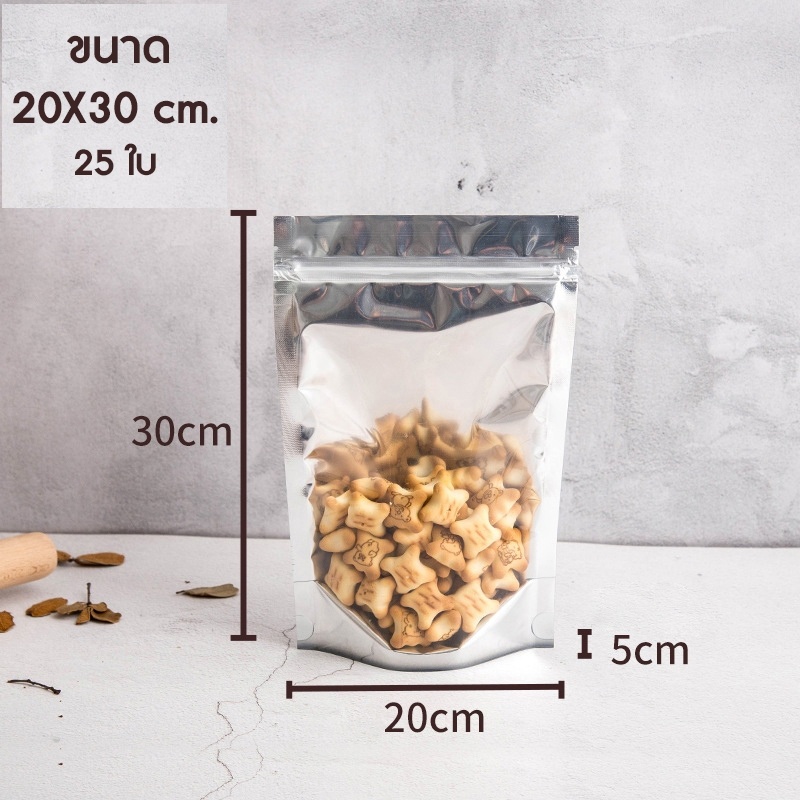 Matapat ถุงฟอยด์เงิน (20x30 (บรรจุ25ใบ)) ถุงซิปล็อคตั้งได้ ด้านหน้าใสหลังเงิน ถุงฟอยด์สีเงิน ถุงขนม ซองขนม (บรรจุ25ใบ)