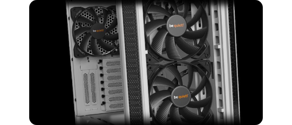 พัดลม Pure Wings 2 ขนาด 140 มม. ที่ติดตั้งไว้ล่วงหน้า 3 ตัวพร้อมใบพัดที่ปรับการไหลเวียนของอากาศ ช่วยให้มั่นใจได้ว่าจะมีการไหลเวียนของอากาศที่สมบูรณ์แบบและการระบายความร้อนที่สม่ำเสมอ ไม่ว่าคุณจะเลือกการกำหนดค่าให้มีการไหลเวียนของอากาศสูงหรือเงียบที่สุดก็ตาม