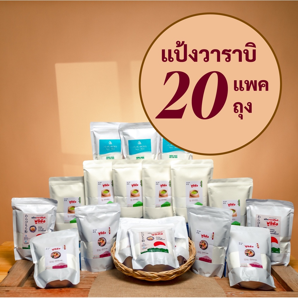 แป้งวาราบิ สำหรับทำขนมวาราบิโมจิ ขนาด 500 กรัม x 20 ถุง วาราบิโมจิ ทำง่าย อร่อยด้วย สูตรวิธีการทำวาราบิโมจิ จากแป้งวาราบิ บ้านโป่งฟูจิซังนวัตกรรมจากญี่ปุ่น ส่วนผสม : わらび餅 แป้งวาราบิโมจิ 100 กรัม (18%) นํ้าตาล 50 กรัม (9%) นํ้าเปล่า 500 มล. (73%) วิธีการทำโดย บ้านโป่งฟูจิซัง 1. ผสมส่วนผสมทั้งหมดใส่หม้อ คนให้น้าตาลและแป้งละลายเข้ากันดี 2. นำหม้อขึ้นตั้งไฟ เปิดไฟกลาง กวนน้าแป้งตลอดเวลา จนน้าแป้งเริ่มเกิดเจลใสๆบริเวณก้นหม้อ วัดอุณหภูมิได้ 60˚ 3. น้ำแป้งจะเริ่มหนึดขึ้นอย่างรวดเร็ว ให้กวนความเร็วปานกลาง ป้องกันการเกิดฟองอากาศตอนใส่ลงพิมพ์ 4. เจลจะเริ่มใสขึ้นวัดอุณหภูมิได้ 75˚ จากนั้นเริมจับเวลา 2 นาที กวนจนครบเวลา แล้ว ยกลงเทใส่ลงพิมพ์ที่รองด้วย ฟิล์มยืดห่ออาหาร เกลี่ยเจล ให้เต็มพิมพ์ และ ห่อเจลให้เรียบร้อย 5. นำลงแช่ใน น้ำเย็นจัด (น้ำ+น้าแข็ง) ทิ้งไว้ 30 นาที 6. เมื่อครบเวลา แกะออกจากฟิล์ม ห่ออาหาร ตัดด้วยกรรไกรแบ่งเป็นชิ้นสี่เหลี่ยมลูกบาศก์ ในน้าเย็นจัด เพื่อป้องกันไม่ให้ติดกัน คุณสมบัติ : แป้งสำเร็จ ทำวาราบิโมจิแสนอร่อย นุ่มนิ่ม หนึบหนับ ทำง่าย ได้ด้วยตัวเอง ฝึกทำทานเอง สนุกและอร่อย มีสูตรให้ เพียงผสมน้ำ ทำตามสูตรหลังห่อได้เลยครับ 500 กรัม x 20 ถุง = 10kg. วิธีเก็บรักษา : เก็บไว้ในที่แห้ง ในอุณหภูมิห้อง