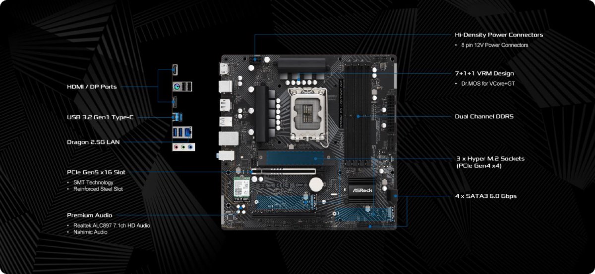 Real Panel Ports: 1x PS/2, 1x HDMI, 1x DisplayPort 1.4, 1x USB-C3.2 port, 3x USB3.2 port, 2x USB2.0 port, 2.5Gb LAN, Audio Jack